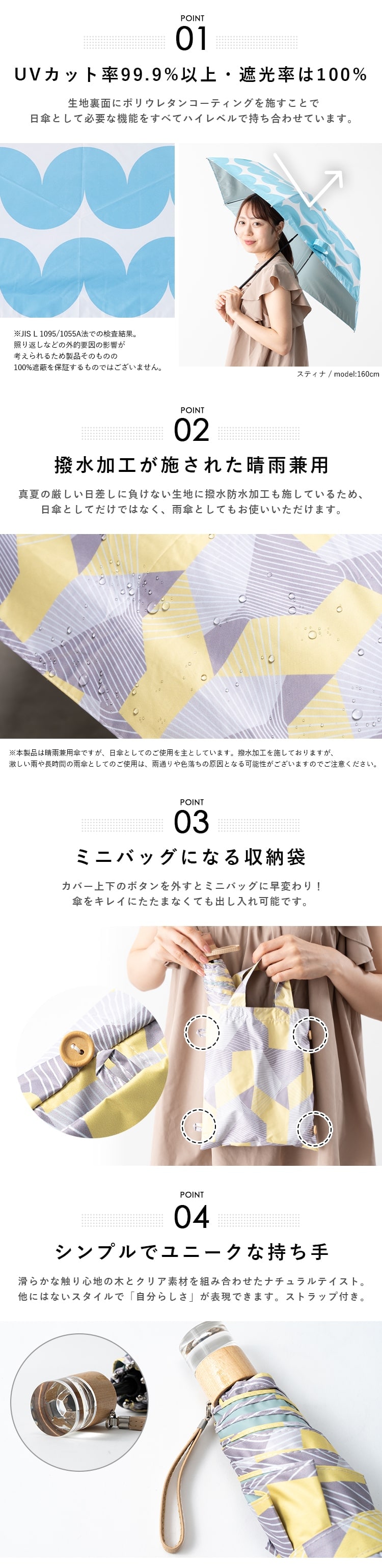 ※本製品は晴雨兼用となっておりますが本来は紫外線防止を目的に開発された生地に撥水加工を施した商品です。激しい雨や長時間雨傘としてのご使用は生地に雨水が染み込む場合がございますので、ご注意下さい。