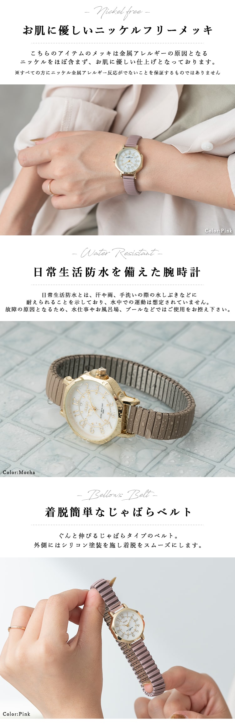 ぐんと伸びるじゃばらタイプのベルトは外側にはシリコン塗装を施し、着脱をスムーズにします。