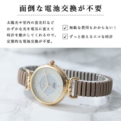 文字盤の下にあるソーラーセルは日光や蛍光灯の光を当てることで充電できるため、定期的な電池交換が不要です。
