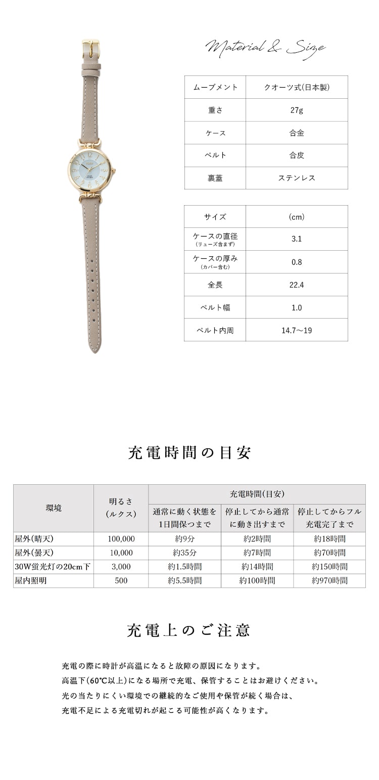 ※文字盤のソーラーパネル部分に光が当たることにより充電されます。充電をする際は文字盤を光源に向けてください。