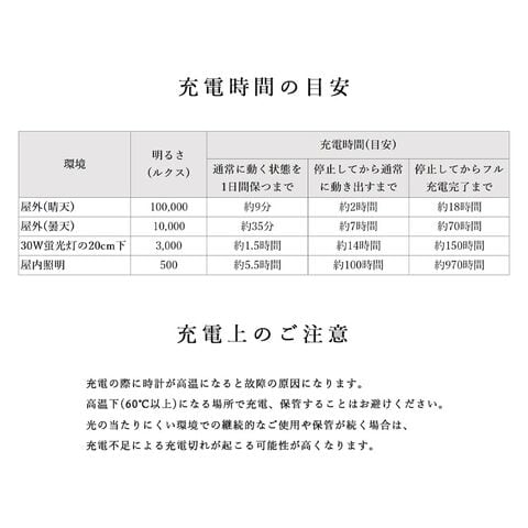 ※長時間の直射日光での充電や、高温の場所を避けて充電してください。内部に熱がこもるとケースの変形やムーブメントの故障を招く恐れがあります。