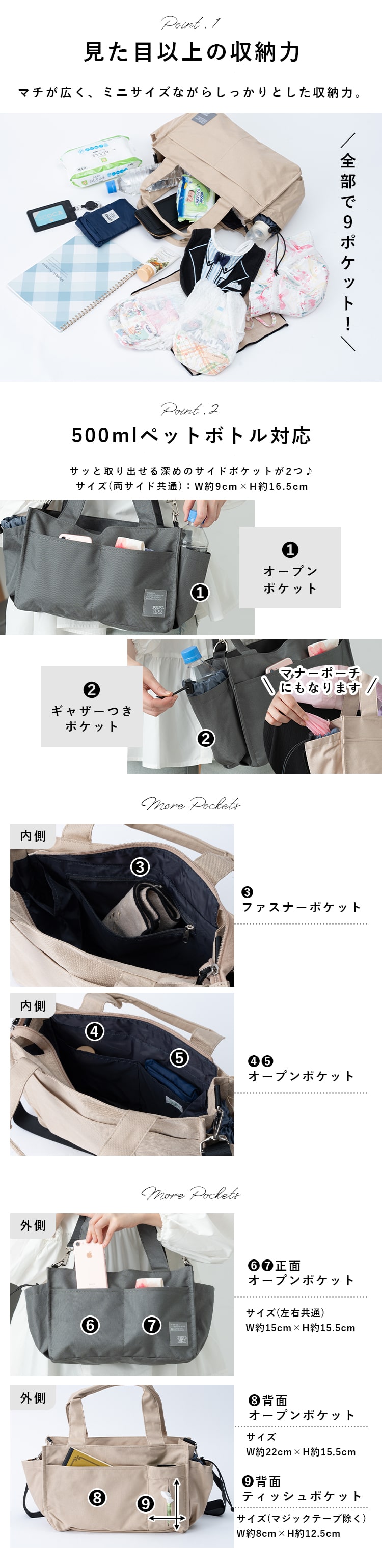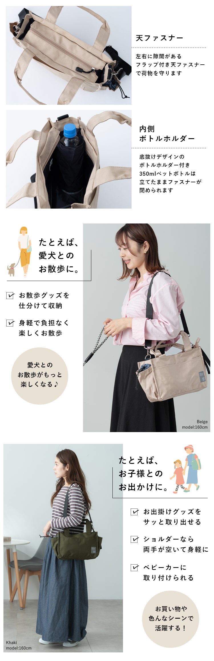 ショルダーバッグ レディース 斜め掛け 犬 散歩バッグ マザーズバッグ 2way 大人 軽量 撥水 ペットボトル 9ポケット おしゃれ ファスナー付き 自立  Beige