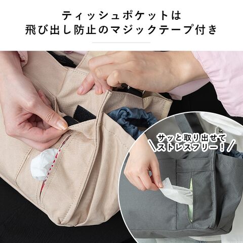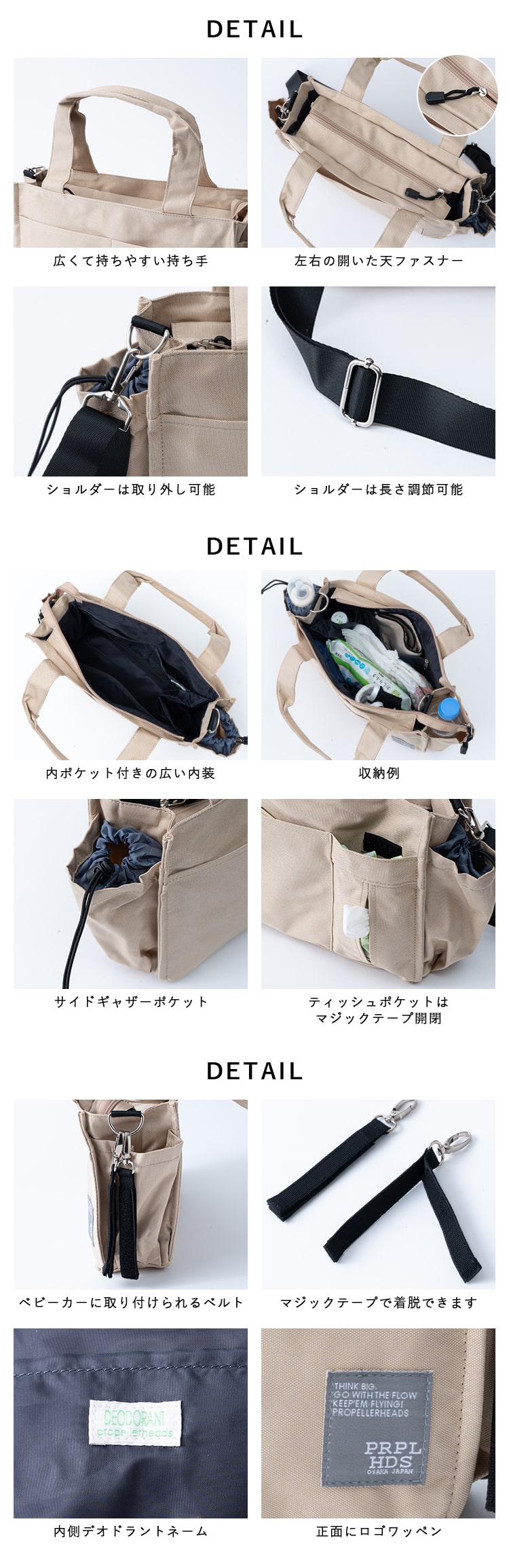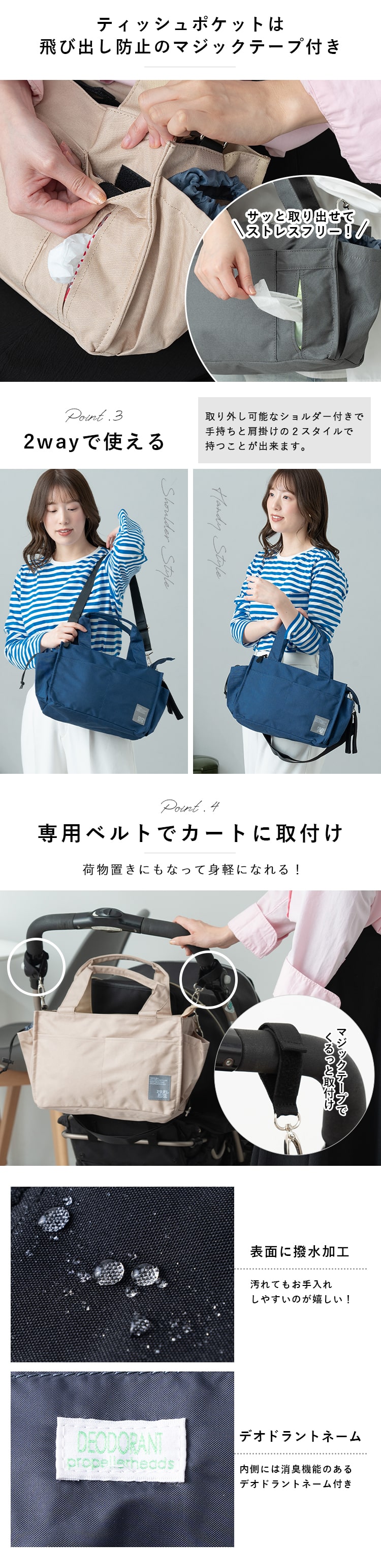 面ファスナーの専用ベルト付きで、ベビーカーなどに取付も出来、マザーズバッグとしても使えます!
