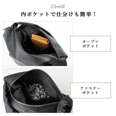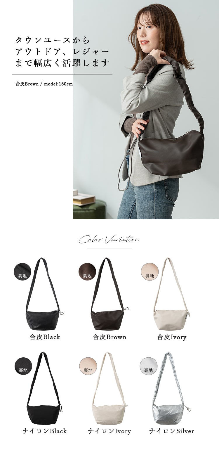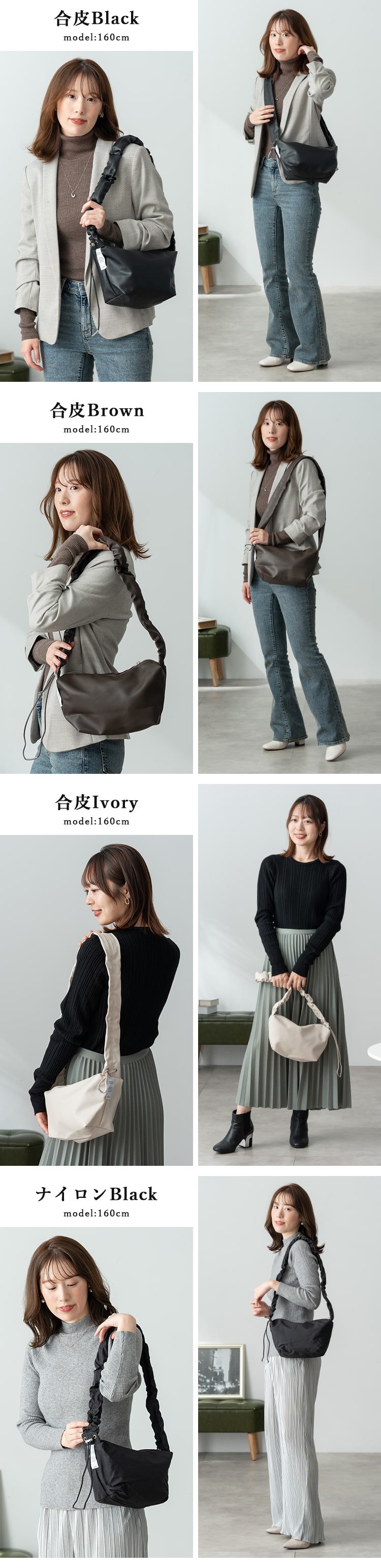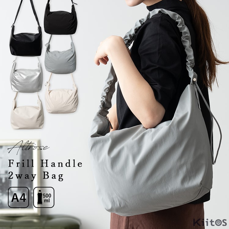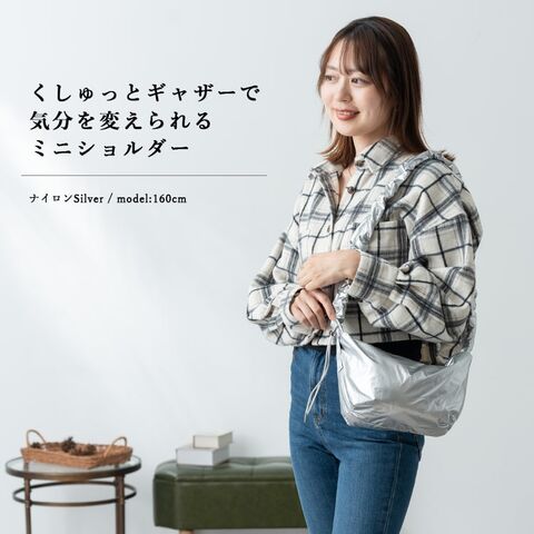 ショルダーの片側の紐を絞ってギャザーショルダーに出来るショルダーバッグ。