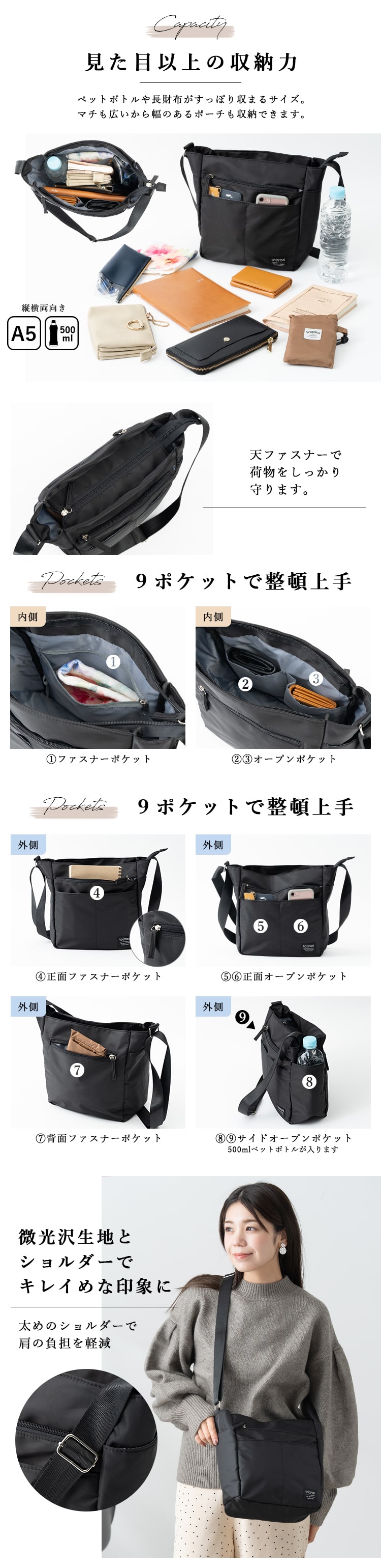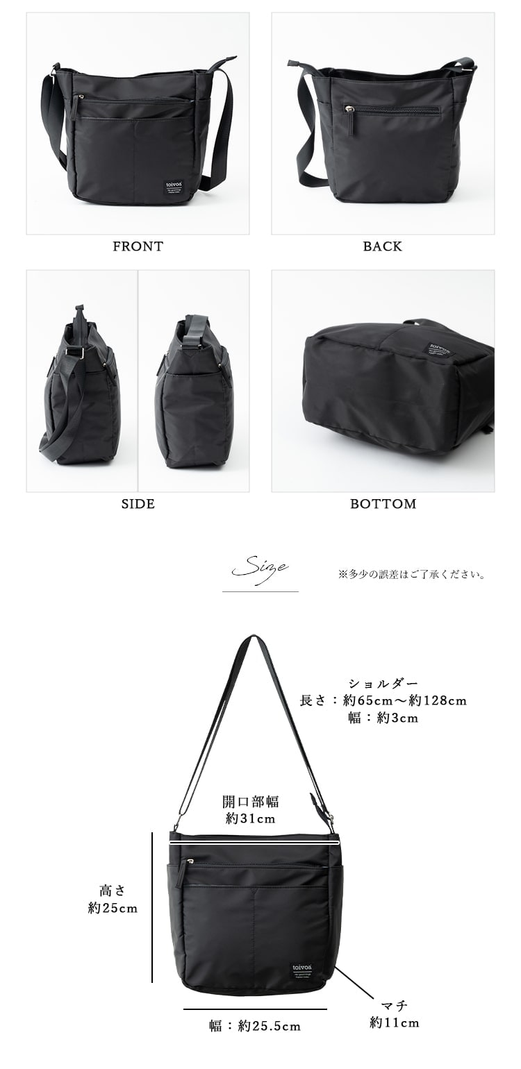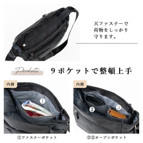 ショルダーバッグ レディース 斜めがけ 大人 軽量 ブランド 大容量 a4 撥水 9ポケット ファスナー付き マチ付き 通勤 通学 旅行 自立 Black