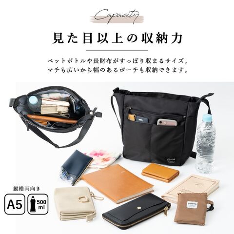 ペットボトルや長財布がすっぽり入るA5対応サイズだから、お出掛け必需品をまとめて持ち運べます。