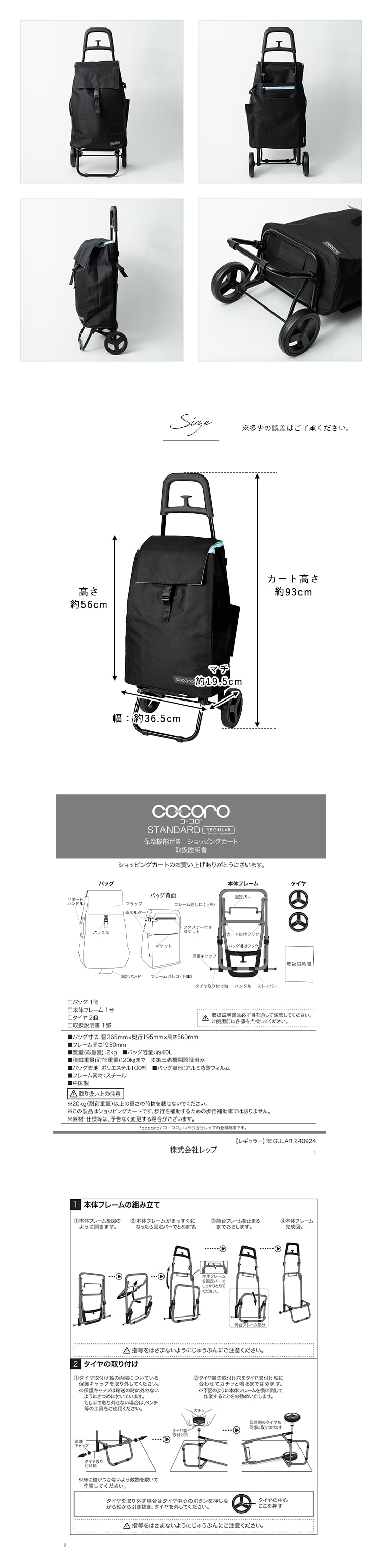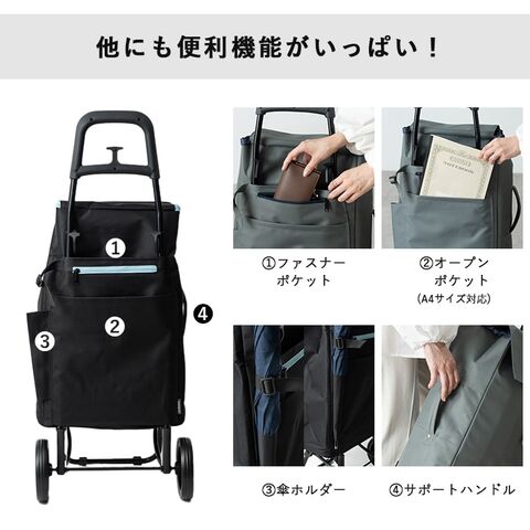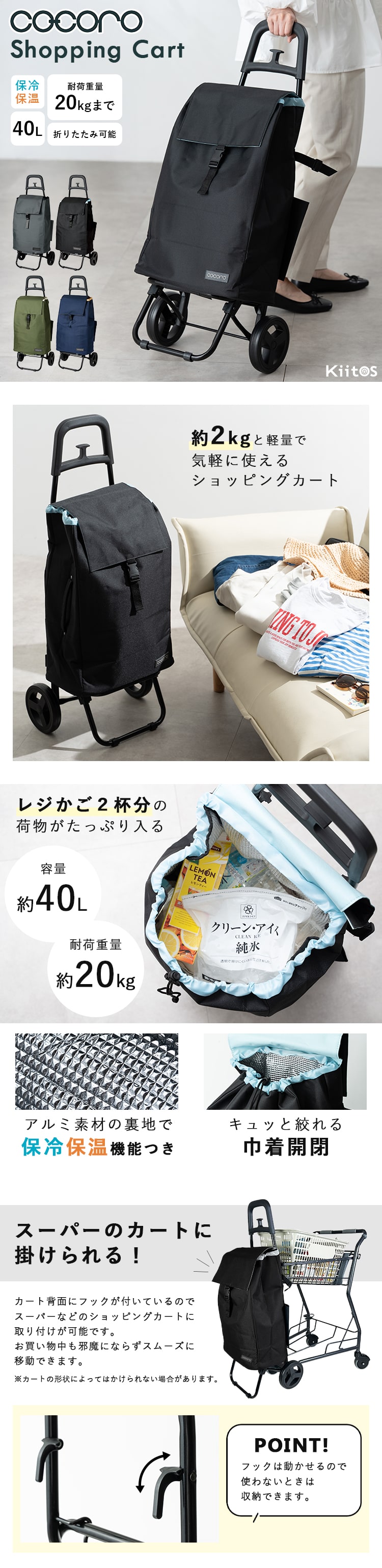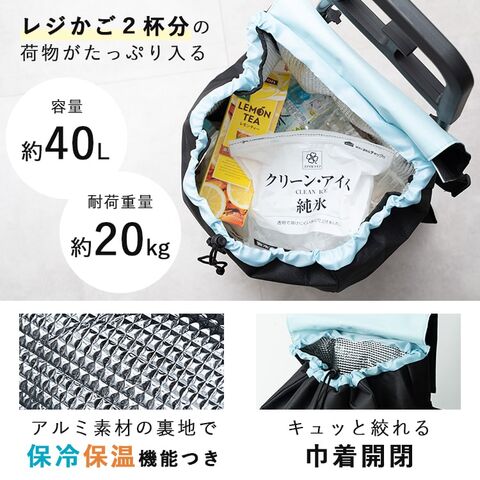 ショッピングカート cocoro 折りたたみ 保冷 保温 40l 軽量 おしゃれ かわいい 大人 コンパクト レジャー アウトドア 大容量 Black