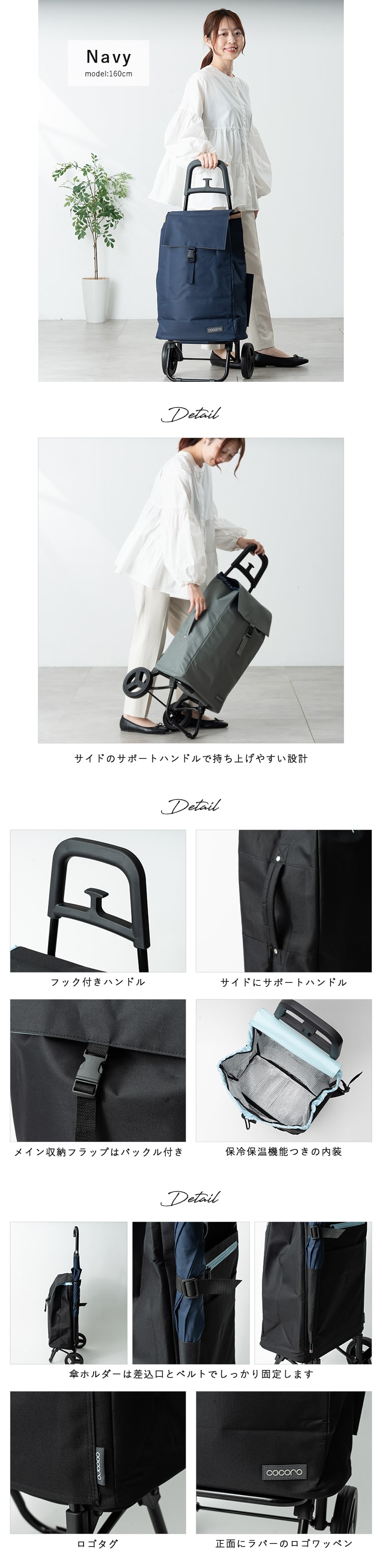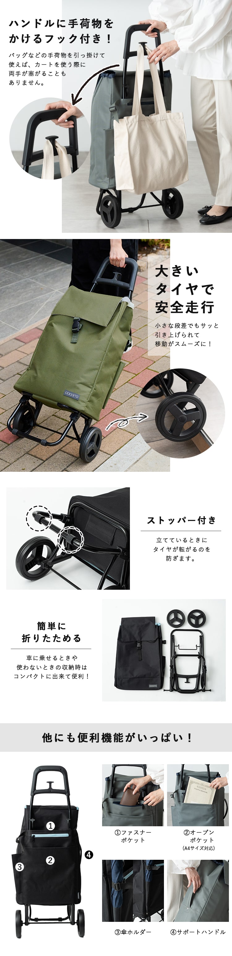 買い物袋やカバンをかけられるフックや傘ホルダー等、便利な機能がつまっています。