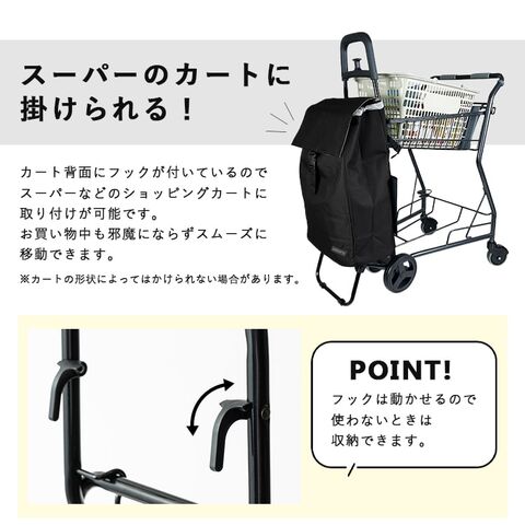 スーパーのカートにかけられるフック付きでお買い物中のカートの置き場に困りません。
