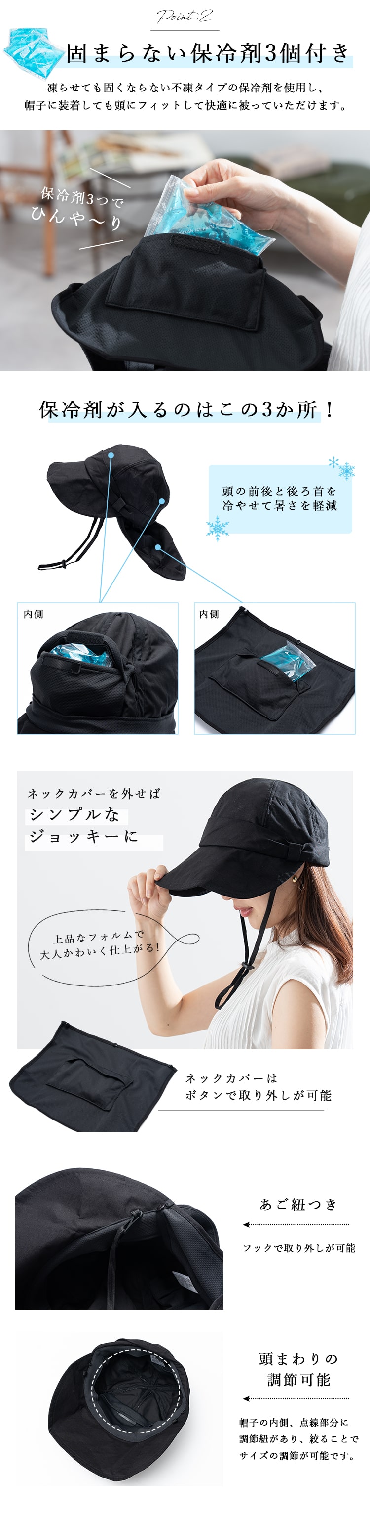 ・固まらない保冷剤が3個付属されており、帽子に忍ばせても形を崩すことなく冷やしてくれます。