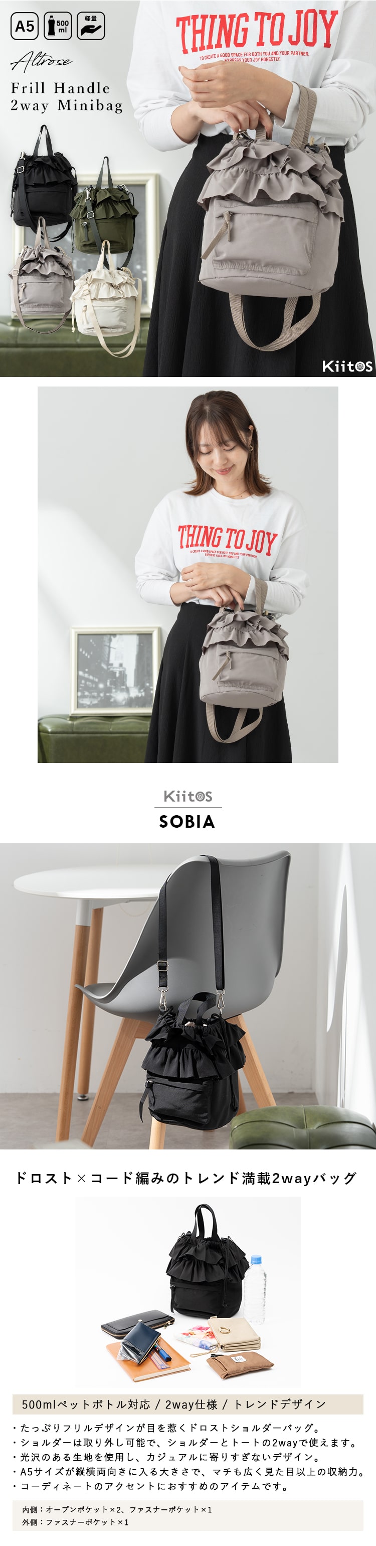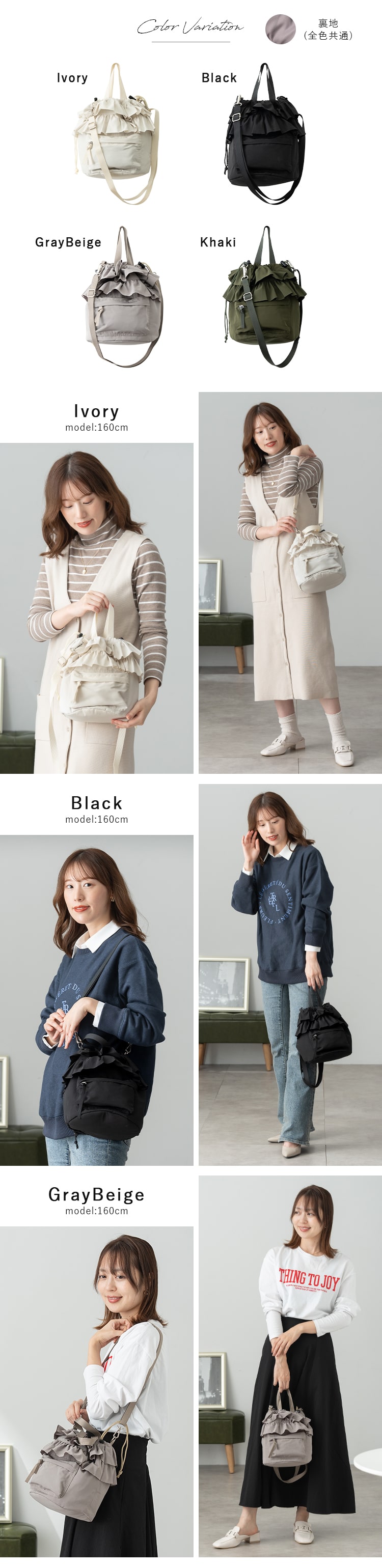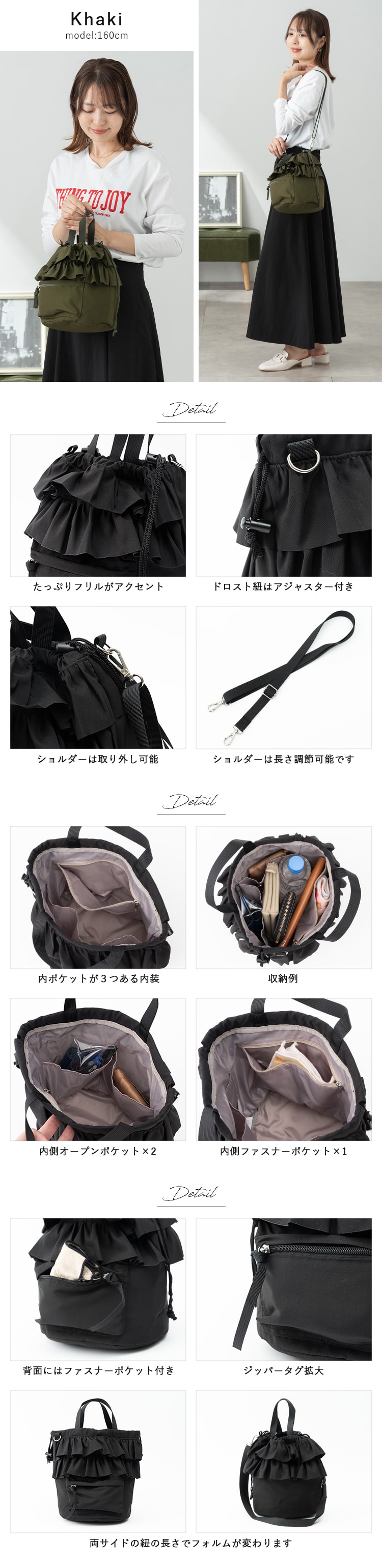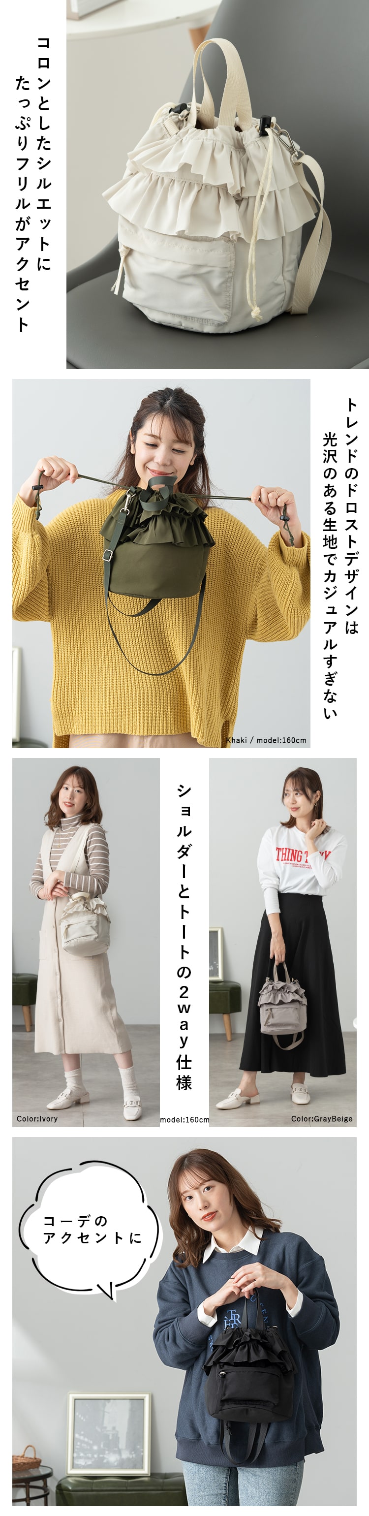 たっぷりフリルデザインが目を惹くドロストショルダーバッグ。