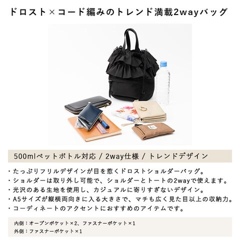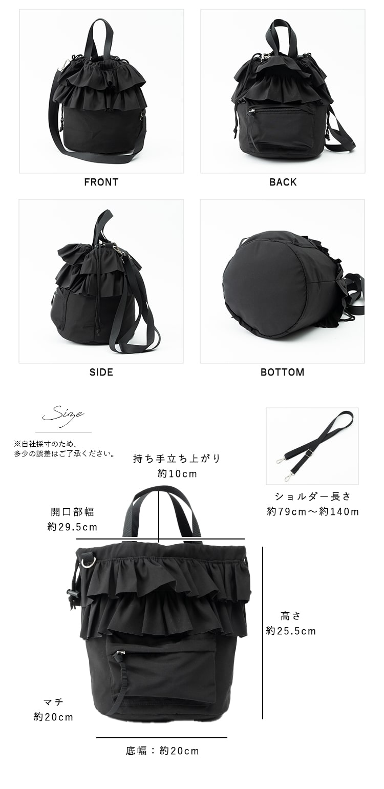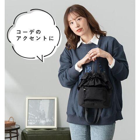 ショルダーバッグ レディース 斜め掛け 大人 巾着 フリル 小さめ 2way トート a5 マチ広 軽量 通勤 通学 学生 Black