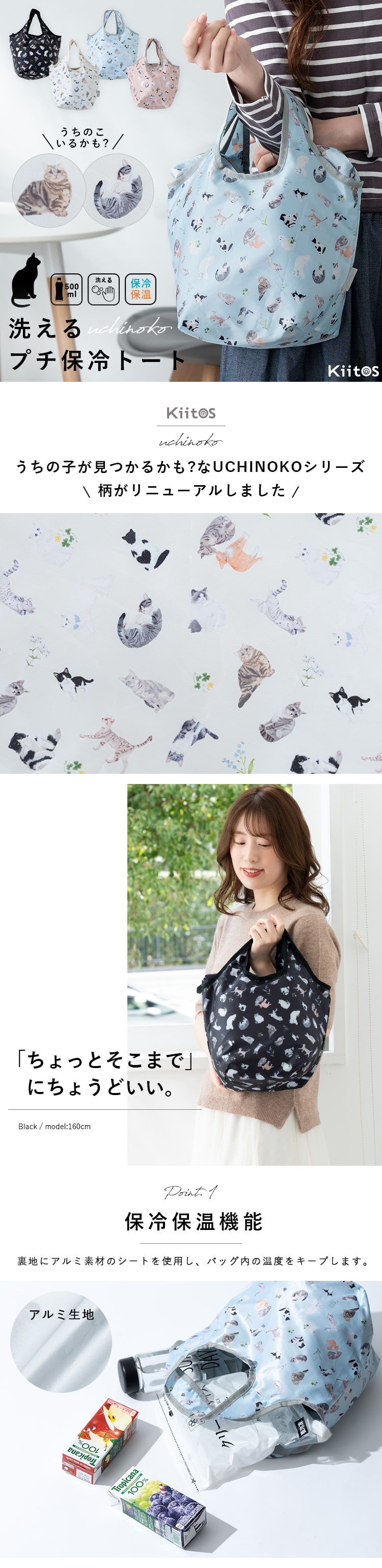 保冷バッグ 小さめ ランチバッグ かわいい 洗える 保温 買い物 コンパクト ミニトート ファスナー付 マチ広 uchinoko 猫 ギフト Black