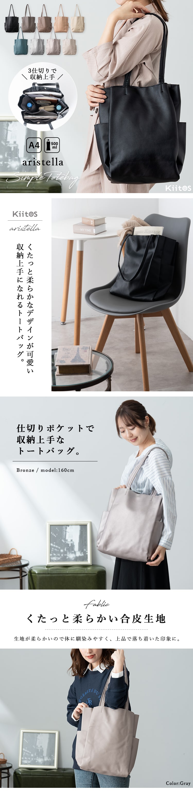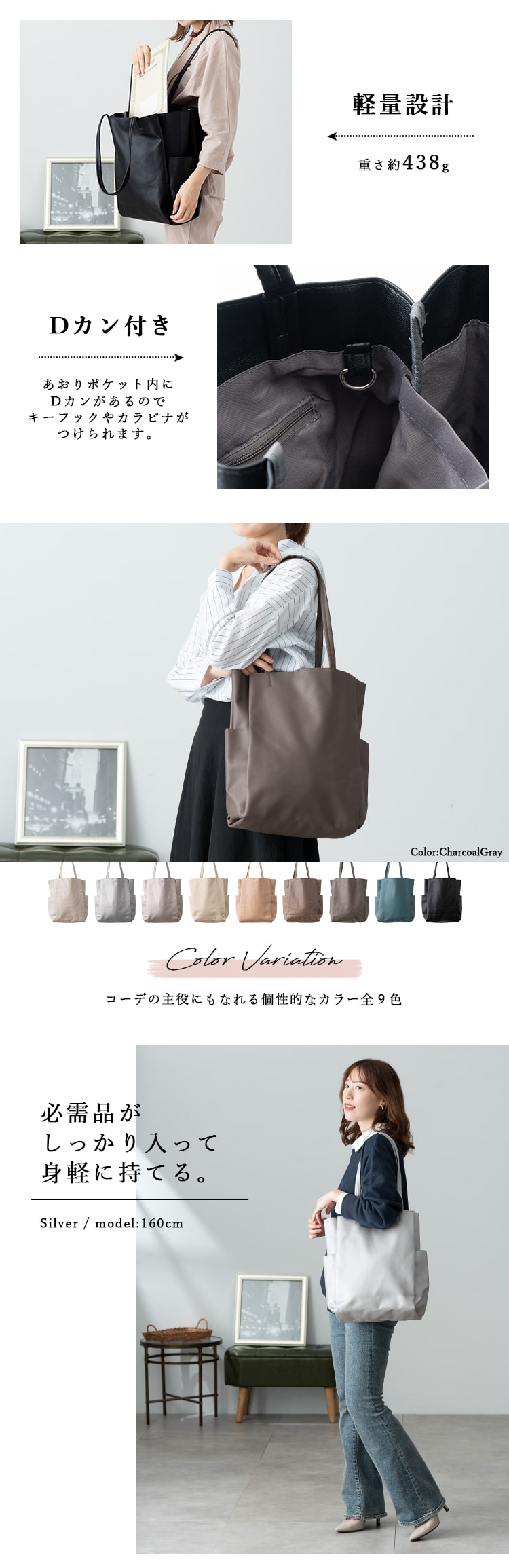 トートバッグ レディース a4 仕切り 軽量 大容量 おしゃれ 大人 シンプル 通勤 通学 マチあり ポケット多い CharcoalGray