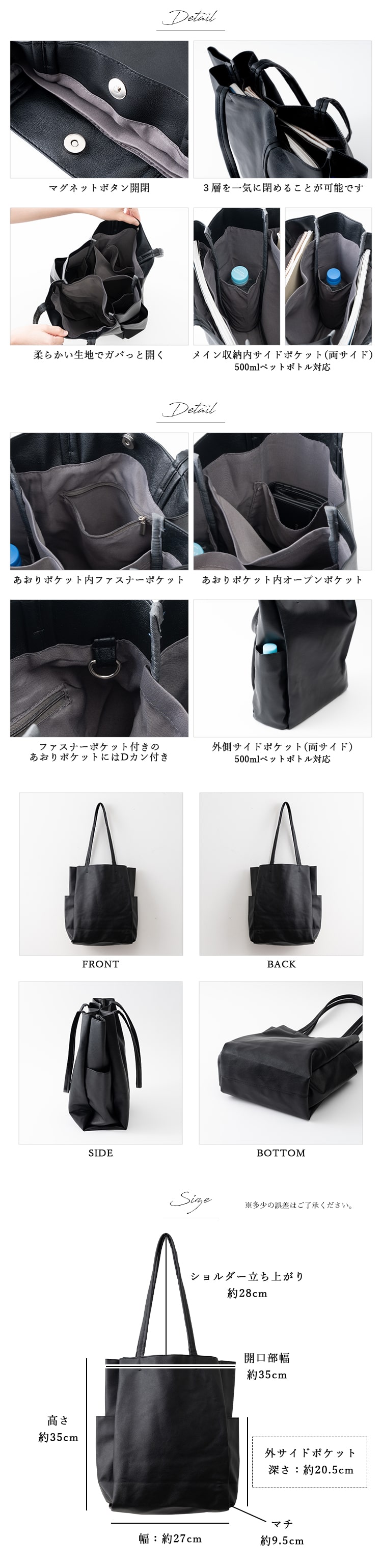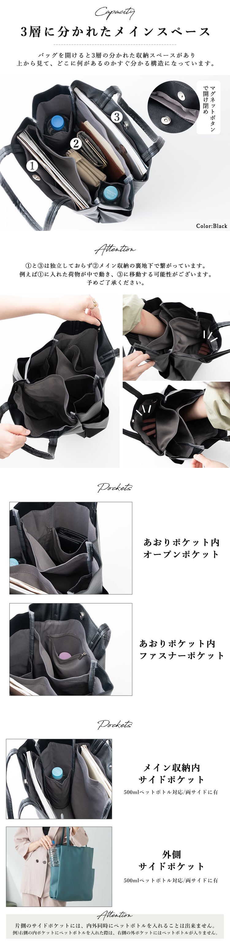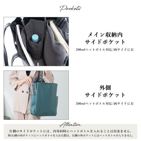 メイン収納:サイドオープンポケット×2(500mlペットボトル対応)