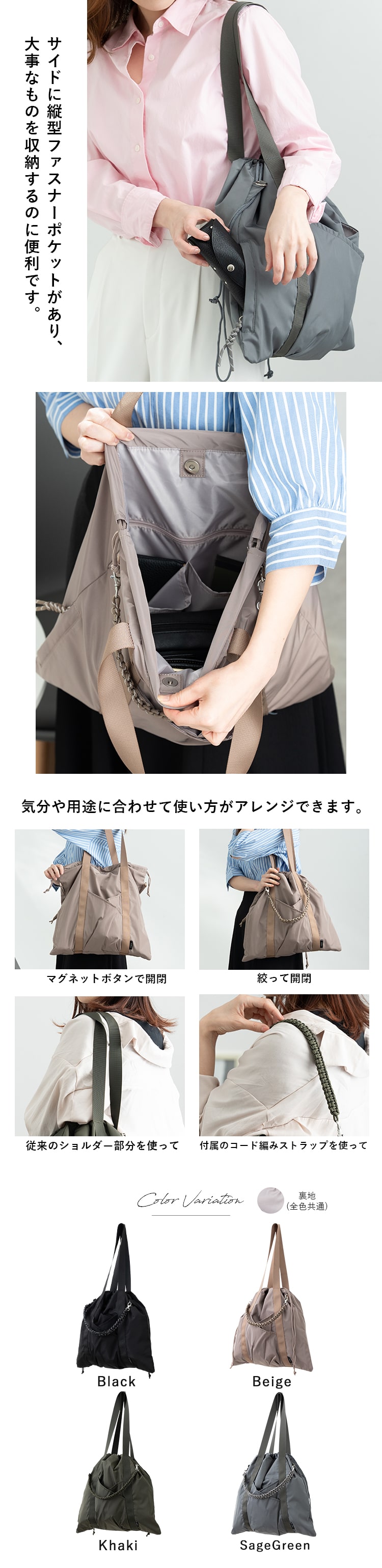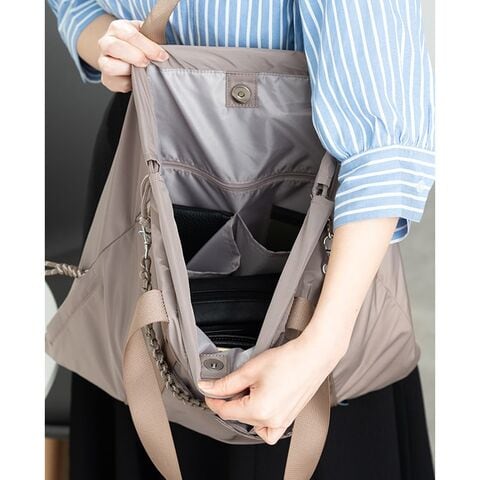 中身に合わせてバッグの開閉を変えることができ、書類などのしっかり形のある荷物を入れたい時はマグネットでパチッと収納。
