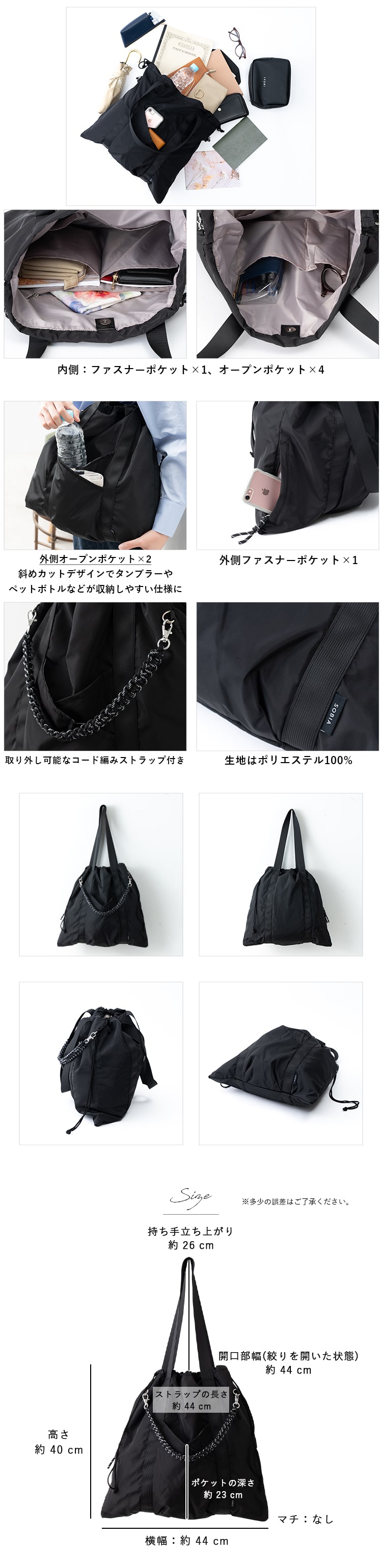 トートバッグ レディース 巾着 a4 大容量 軽量 コード編み 通勤 通学 肩掛け 8ポケット マザーズバッグ おしゃれ 大人 韓国 旅行 ギフト Black
