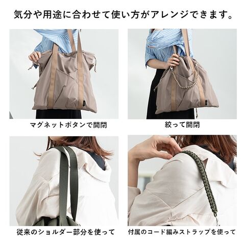 さらに、本来のトートショルダーを使った持ち方はもちろん、付属のコード編みストラップを持ち手にすることも可能です!