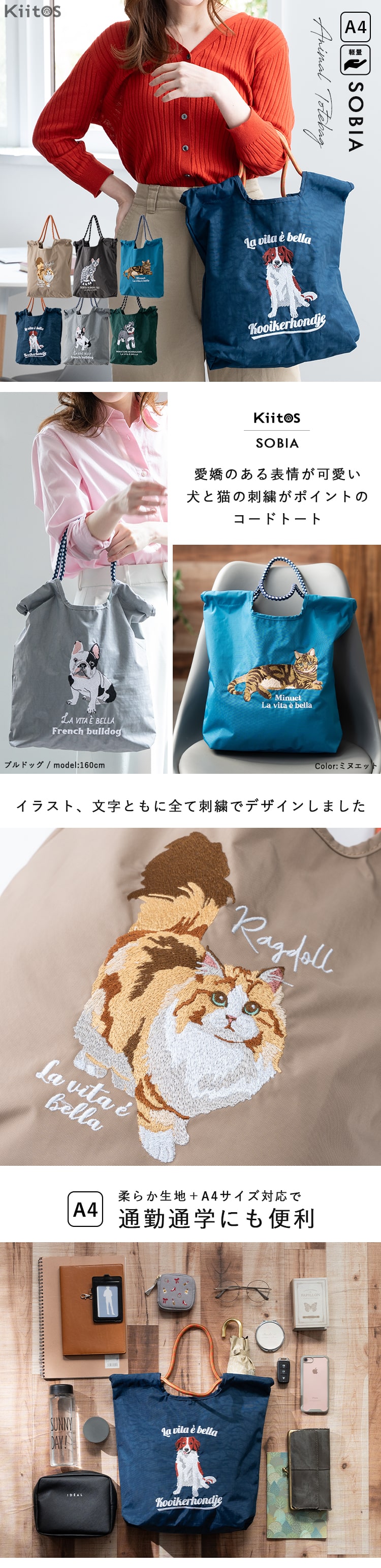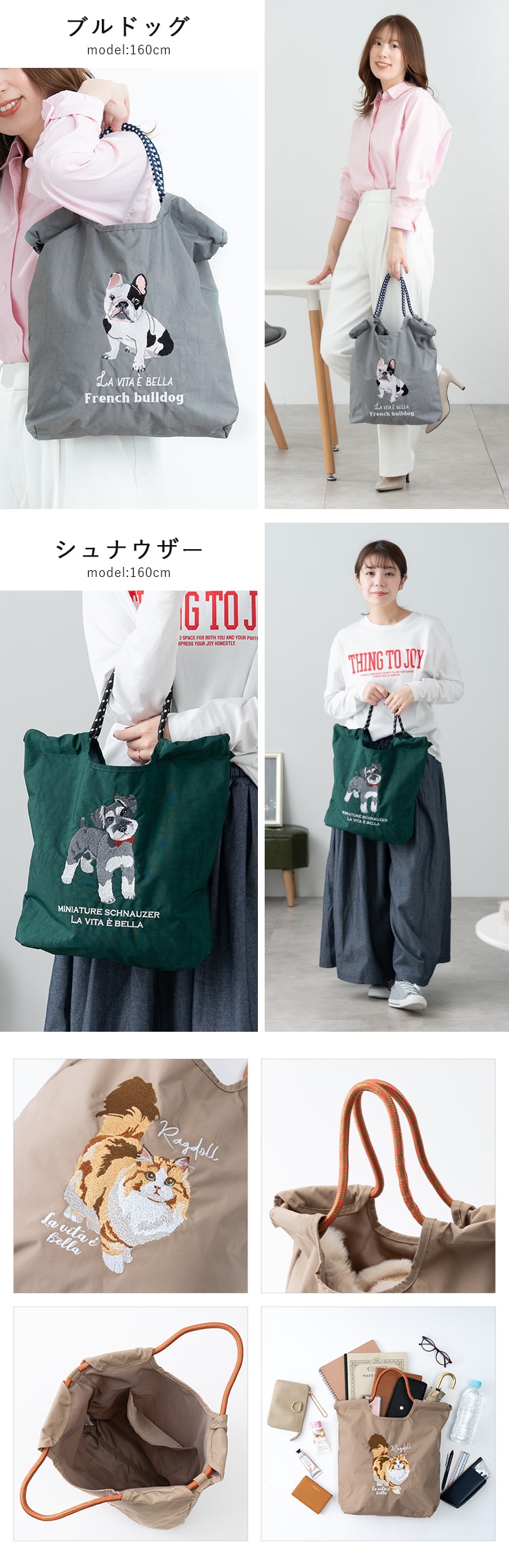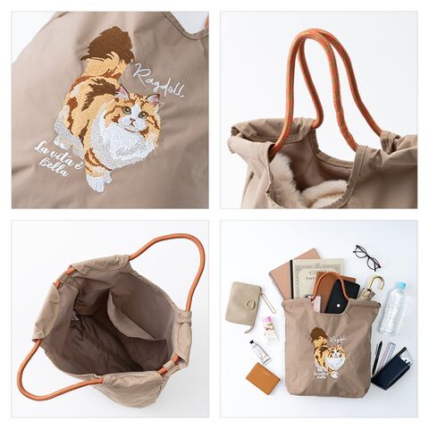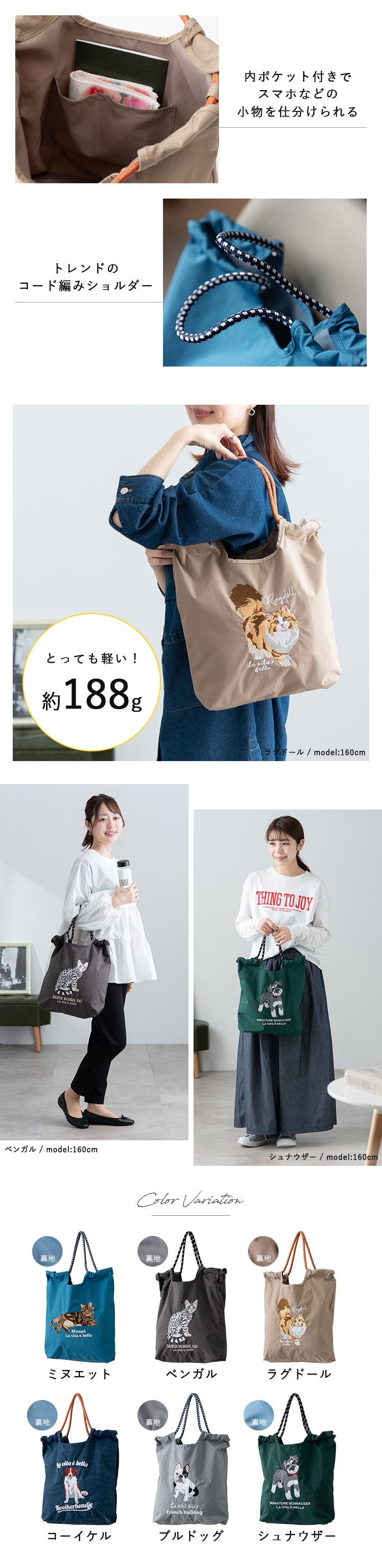 トートバッグ レディース 刺繍 アニマル a4 大容量 軽量 猫 犬 コードハンドル 肩掛け ナイロン 通勤 通学 おしゃれ エコバッグ ギフト コーイケル