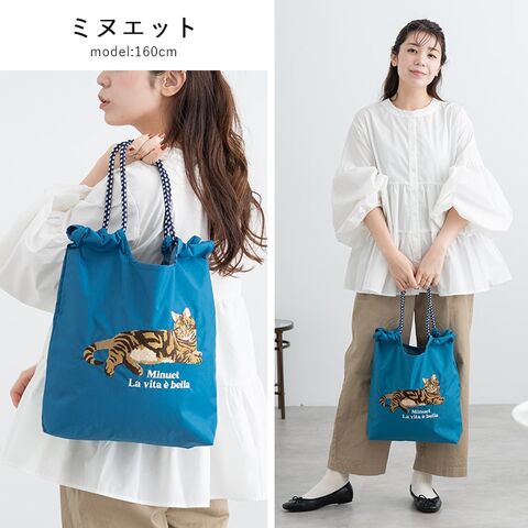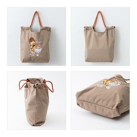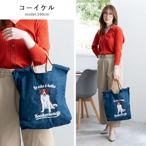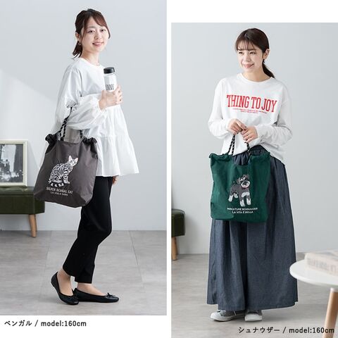 愛嬌のある表情が可愛い犬と猫の刺繍がポイントのコードハンドルトートバッグ。