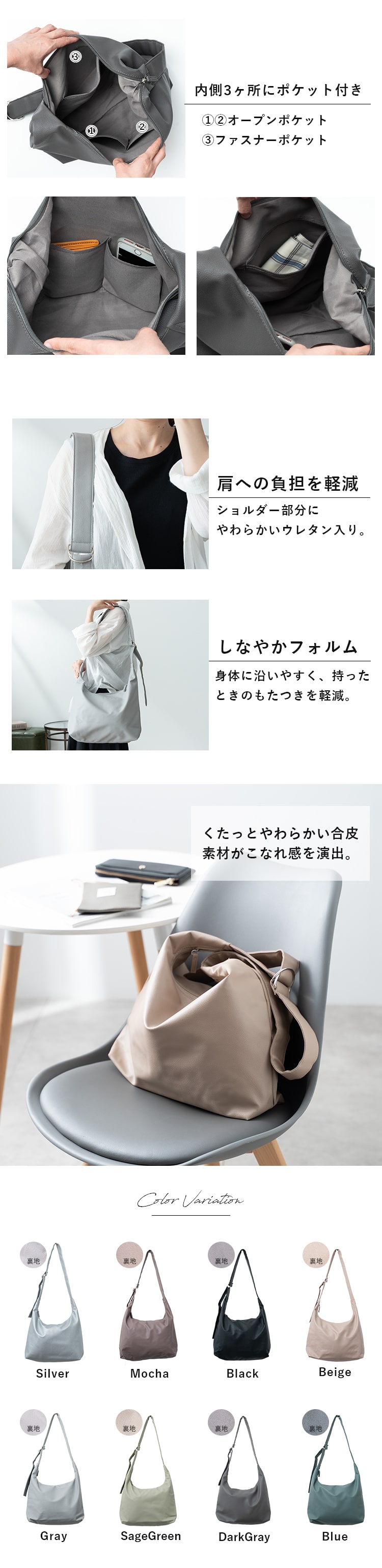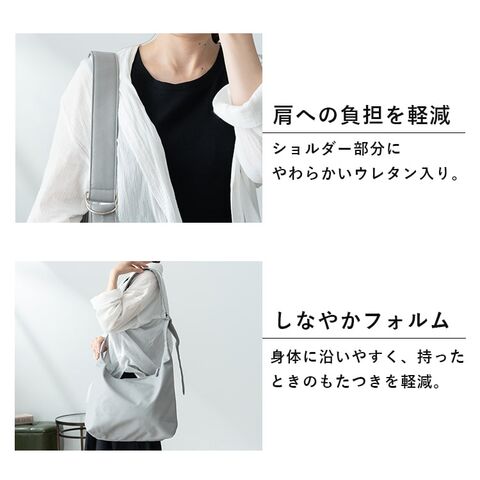 身体に沿うしなやかなフォルムと幅広のショルダーが、持ったときのもたつきを軽減。