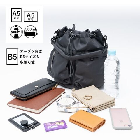 完全に絞った状態でもA5サイズのノートや長財布、500mlペットボトルが縦横どちら向きにも収納可能です。