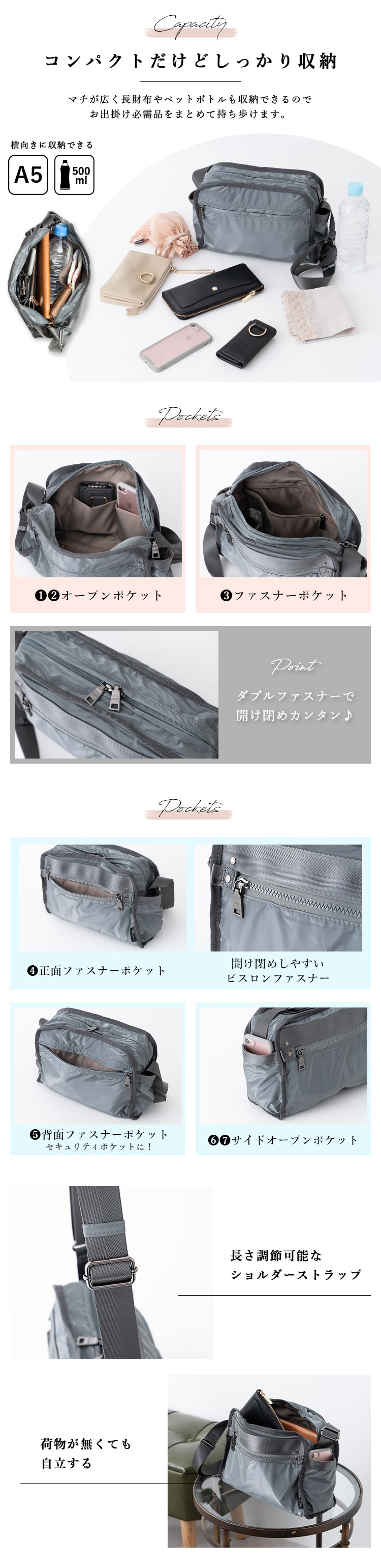A5サイズや500mlペットボトルが横向きに入るサイズで、ポケットも7か所あり小物も整理できます。