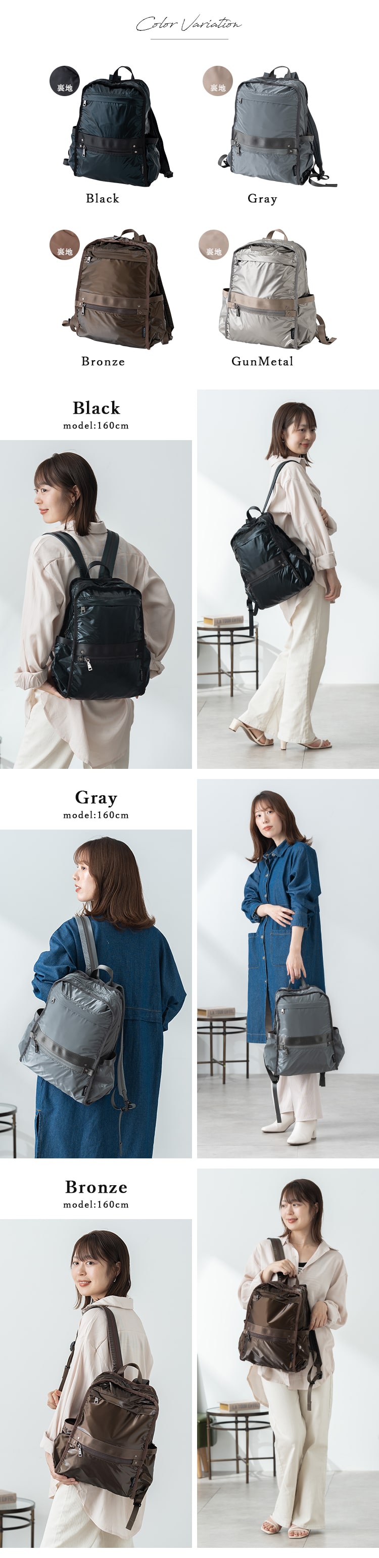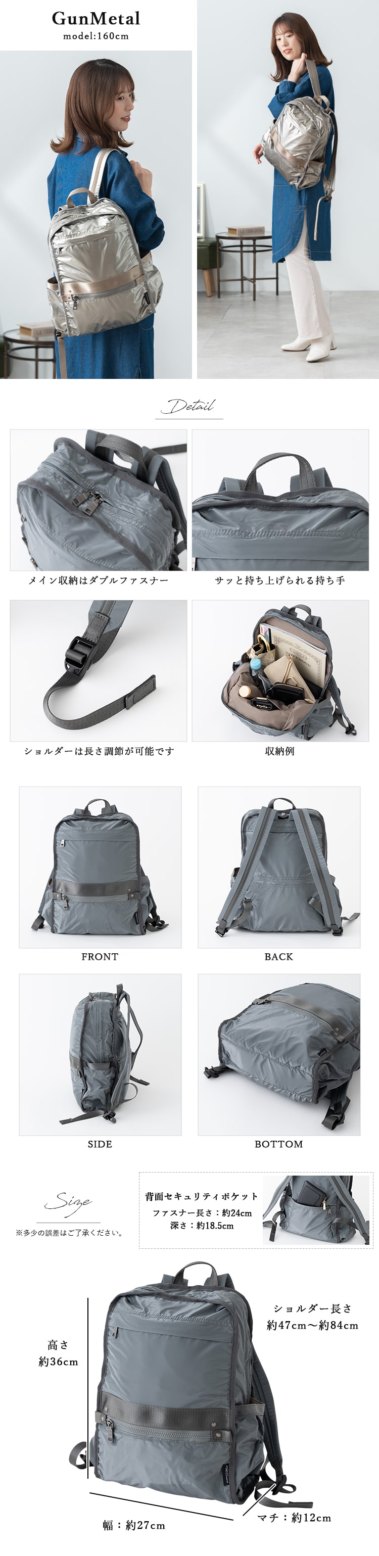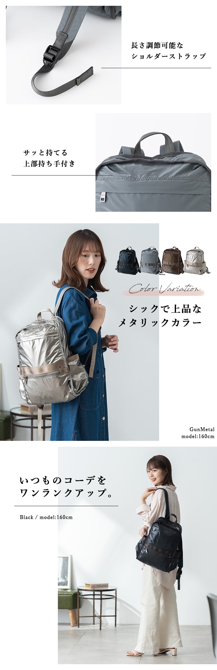 シックなメタリックカラーが大人可愛い大きめリュック。