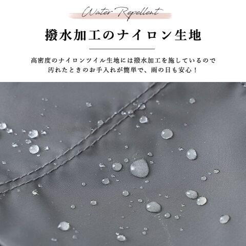 高密度のナイロンツイル生地は軽さと丈夫さを兼ね備えており、撥水加工を施しています。