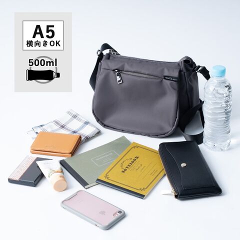 A5サイズや横向きのペットボトルも収納可能で、しっかり自立する設計も嬉しいポイント。