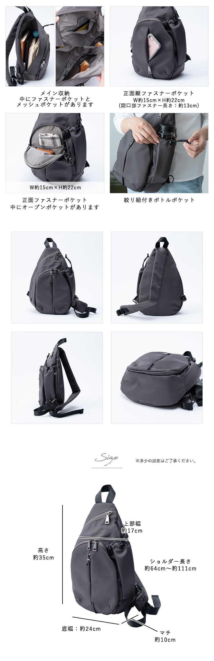 正面縦ファスナーポケット:W約15cm×H約22cm(開口部ファスナー長さ:約13cm)