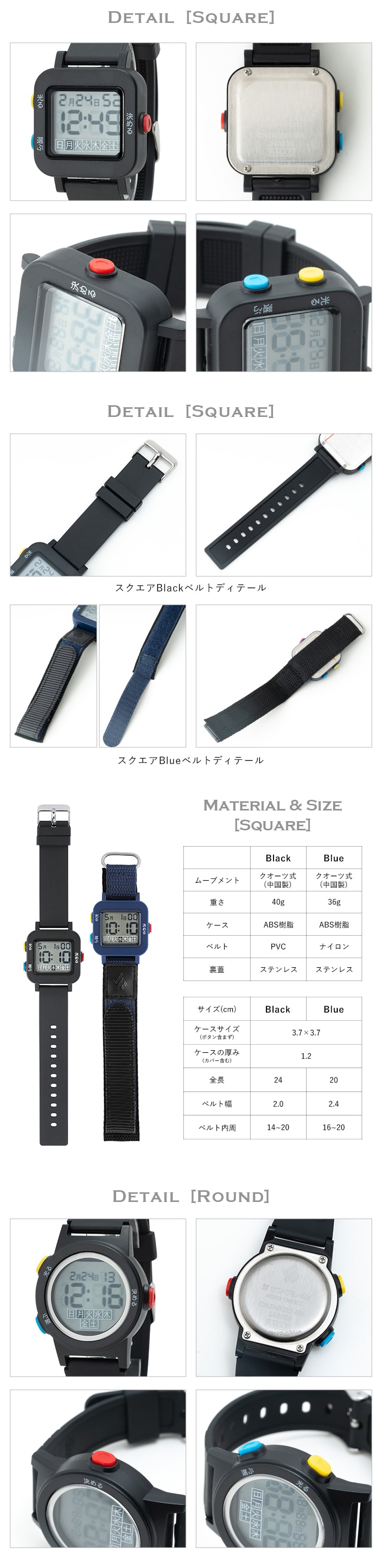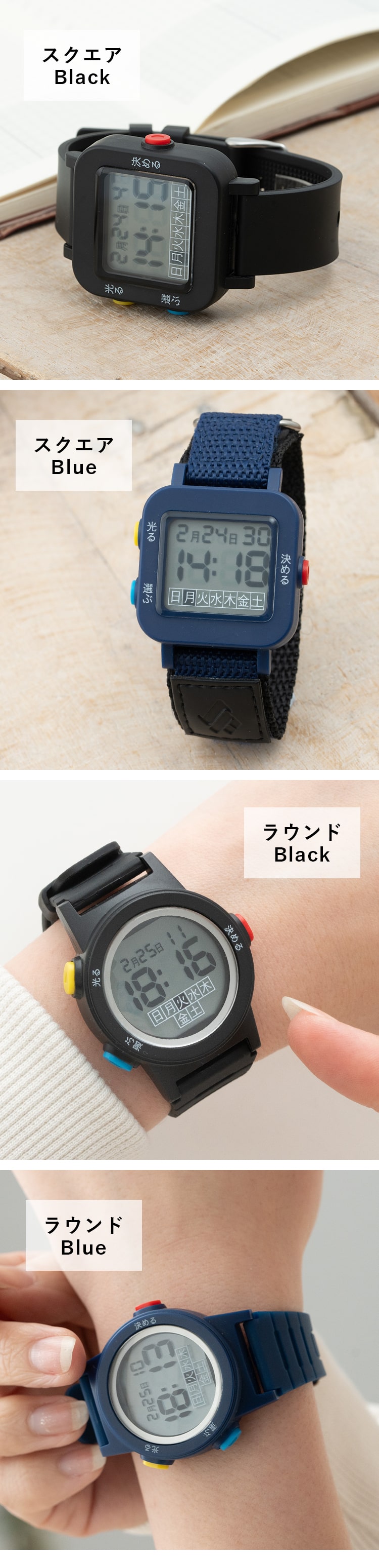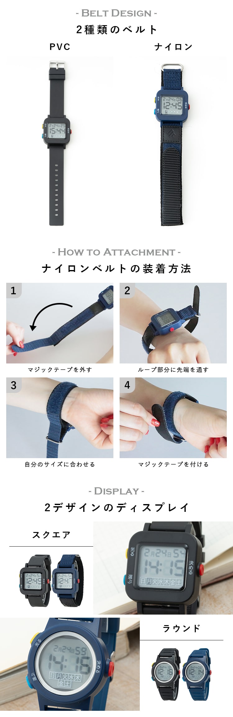 スクエアとラウンドの2種類のディスプレイ、PVCとナイロンの二種類のベルトがあるので使いやすいものを選べます。