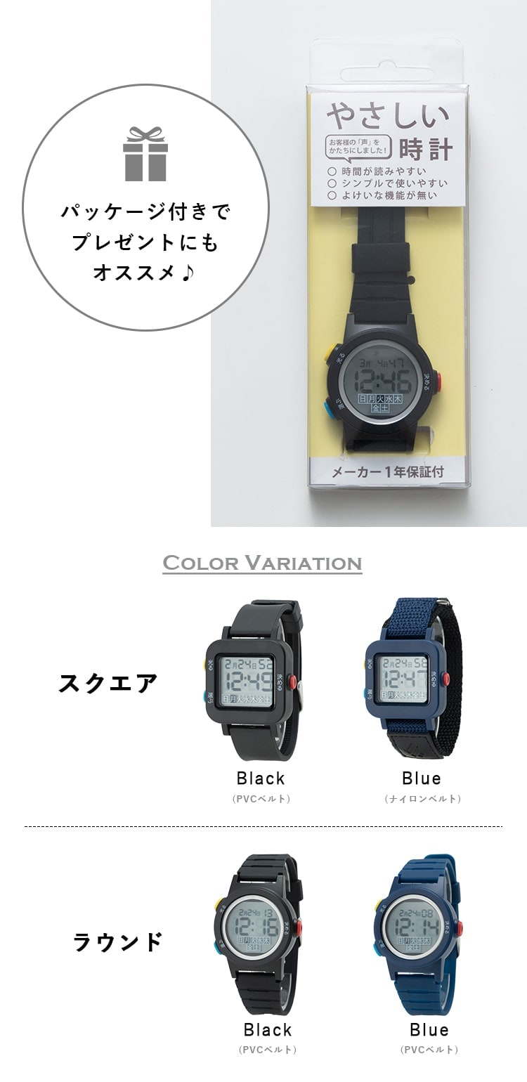 腕時計 レディース メンズ デジタル ブランド 防水 やさしい時計 簡単操作 カレンダー 50代 60代 70代 ギフト スクエアBlack