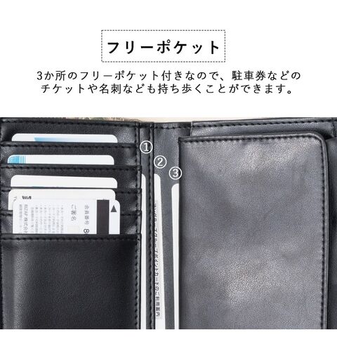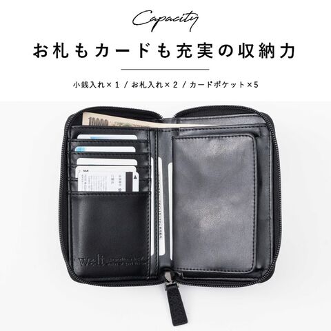 お札入れが2つ、カード入れが5つ、小銭入れの裏側にもカード入れが付いており、充実の収納力。