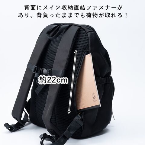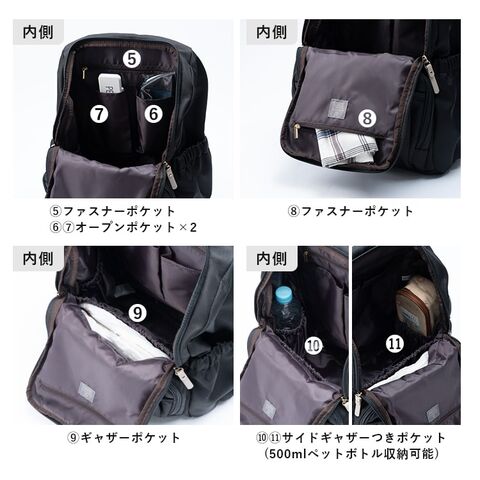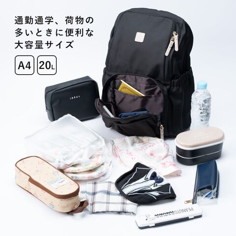 メイン収納はA4サイズを縦に収納でき、内側にはボトルを立てて収納できるギャザー付きのポケットもあります。