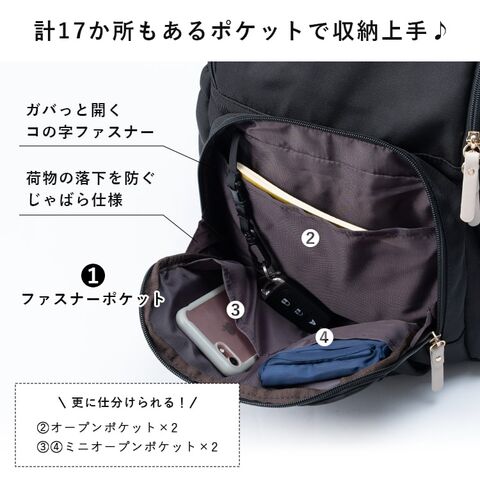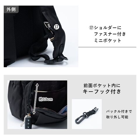 メイン収納への背面直結ファスナーや計17か所のポケットやキーフックなど、小物の整理もしやすい内装です。