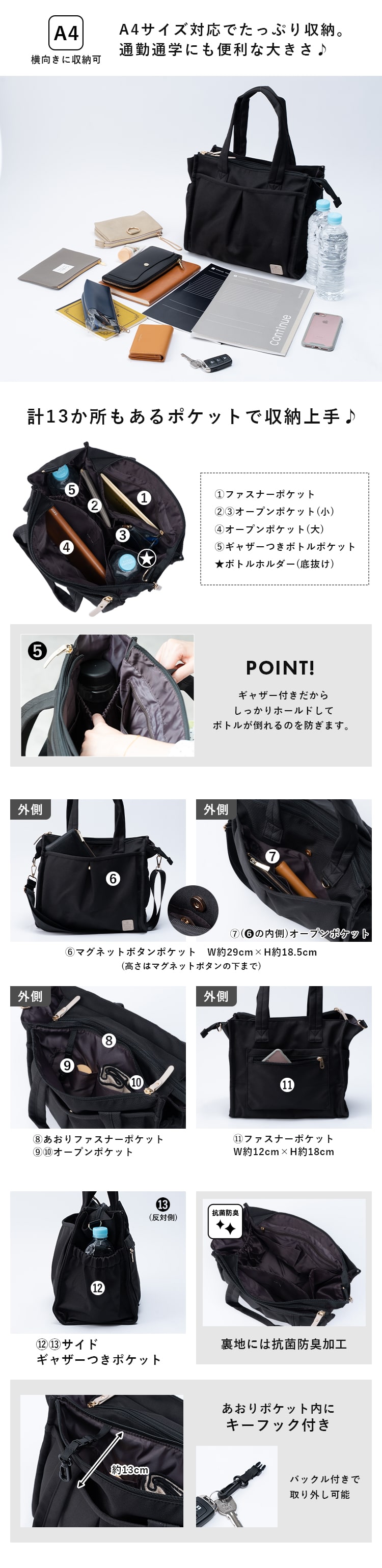 トートバッグ レディース ブランド walt 2way ショルダーバッグ 斜め掛け おしゃれ 軽量 抗菌 13ポケット 大容量 a4 撥水 自立 旅行 通勤 Ivory