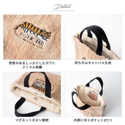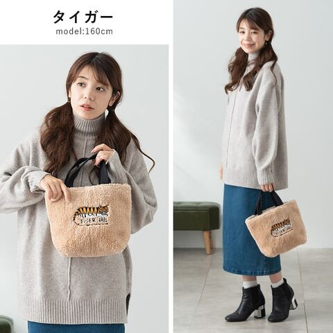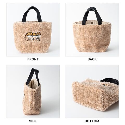 アーティスティックなデザインの動物たちが刺繍されたボア生地ミニトートバッグ。