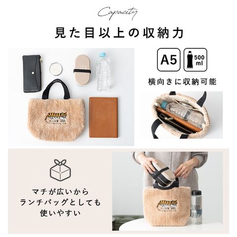 A5サイズや500mlペットボトルが横向きに入る大きさで、マチも広いからランチバッグとしても◎