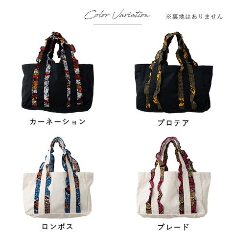 シンプルなキャンバスバッグに、アフリカンプリント柄のフリルををプラスしたトートバッグ。