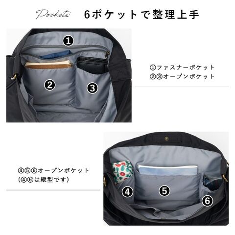 A4サイズ対応で内側にはボトルホルダーにもなるポケットが合計6か所あるから荷物をしっかり収納!