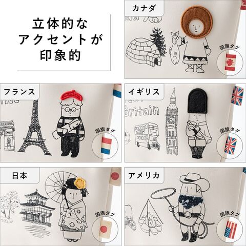国ごとの国旗のタグもついたこだわりいっぱいの「世界の人」シリーズの小物入れ。