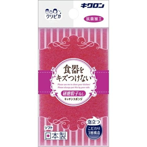泡立ちの早さと泡持ちを兼ね備えたこだわりの3層構造です。研磨粒子なしナイロン不織布を使用しており、食器をキズつけず、プラスチックやガラス製品などの汚れ落としに便利です。スポンジ部分に銀系抗菌剤を練り込んであるので、清潔にご使用頂けます。