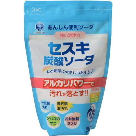 「キッチンクラブ セスキ炭酸ソーダ 500g」は、手垢汚れ・油汚れ・たんぱく質汚れをアルカリパワーで落とします。手肌への負担が少ない重曹と洗浄力の強い炭酸塩の中間に位置する物質です。強い洗浄力を持ちながら、手肌への負担も少なく水に溶けやすい、環境にやさしい無機物です。