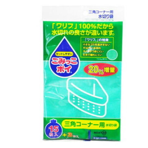「三角コーナー用水切り袋 ごみっこポイ 15枚入」は、タテヨコに加え斜めにも細かな繊維の入った、特殊な網目状のポリエチレン不織布「ワリフ(R)」を使用した三角コーナー用の水切り袋です。素早く水切れし、小さなゴミを逃しません。ヌメリをつきにくくし、流しまわりを衛生的に保ちます。セットがしやすく丈夫で破れにくい作りです。製品本体及び外装袋は、燃やしても有毒なガスは発生しません。キッチンに爽やかな、淡い緑色。使用上の注意火のそばに置かないで下さい。燃えたり品質が損なわれる恐れがあります。品質表示原料樹脂:高密度ポリエチレン耐冷温度:マイナス30度JAN 4903652241141CS:100