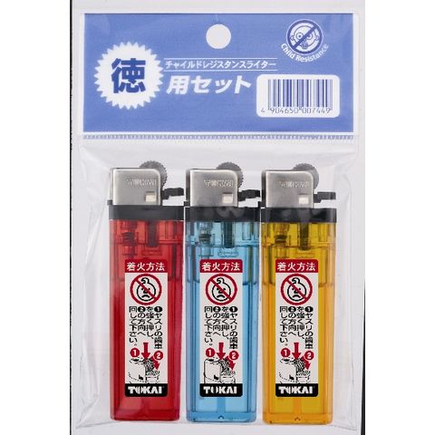 2段階式着火のヤスリライターの3本パック。 空回り式で、ヤスリの歯車を強く押し、回して着火するタイプ。