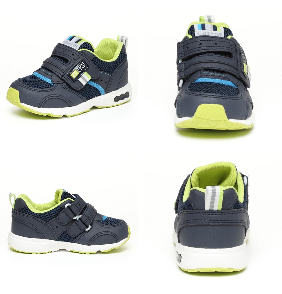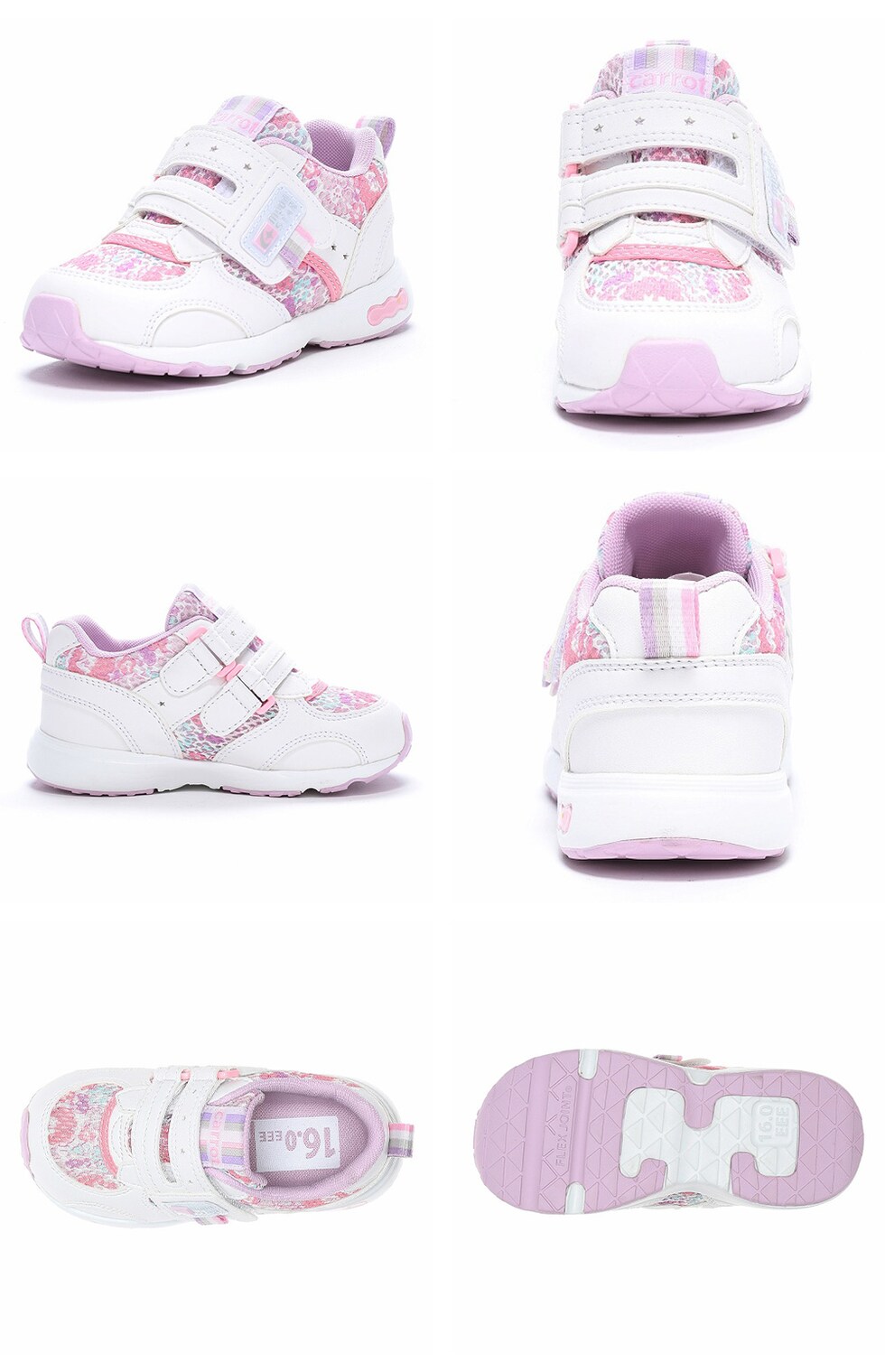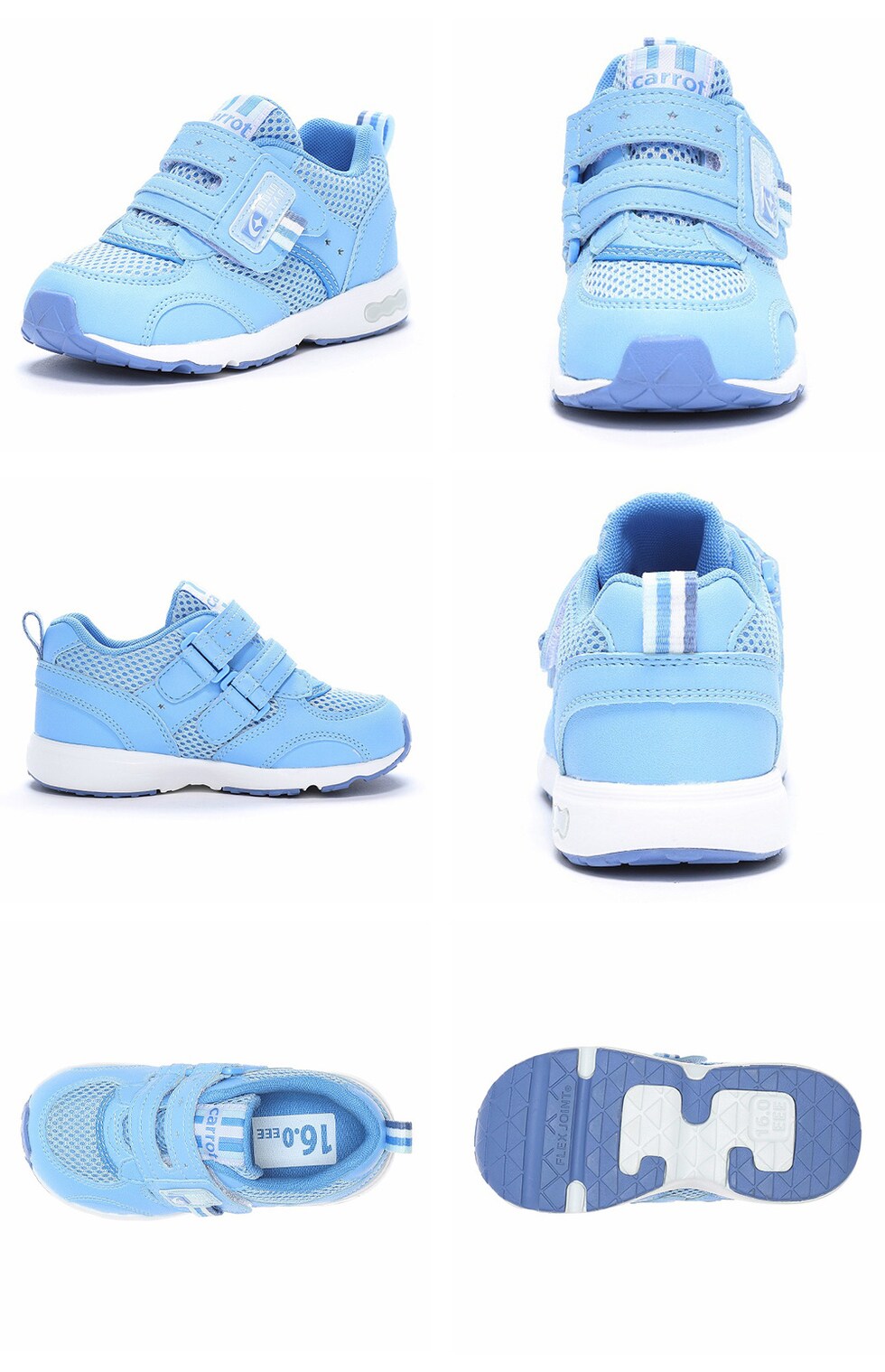 「子どもの足にいいことぜんぶ」の想いから生まれた機能シューズ「ムーンスター キャロット」の急速乾燥性に優れた幅広「3E」シューズです。水が浸み込みにくく乾きやすい素材を使用しているので、汚れても気軽に洗えて清潔です。アッパーはメッシュと合成皮革のコンビで柔らかく、履き口が大きく開くので脱ぎ履きしやすい作りになっています。子どもの足の成長をサポートする「4つの機能(つま先ゆったり/カウンターボックス/フレックスジョイント/洗えるインソール)」に加え、「速乾性」を備えた機能商品です。重さは16.0cmで片足約115gです。【ワイド設計】幅広の方に対応した商品です。【つま先ゆったり】つま先にゆとりを持たせた形状で、足の指を圧迫せずにのびのび動かせます。【カウンターボックス】子どもの柔らかくゆがみやすい足を箱型構造でしっかり支えます。【フレックスジョイント】足の曲がりと同じ位置で靴が曲がる設計で、足に余計な負担をかけません。【Ag+抗菌防臭】銀イオンの抗菌作用でにおいのもととなる菌の増殖を抑制し、防臭効果を発揮します。 【洗えるインソール】足裏になじみ、取り出して洗濯ができるので靴内を清潔に保てる中敷きです。【急速乾燥】従来品の約2倍の速さで乾きます(当社品比較)。