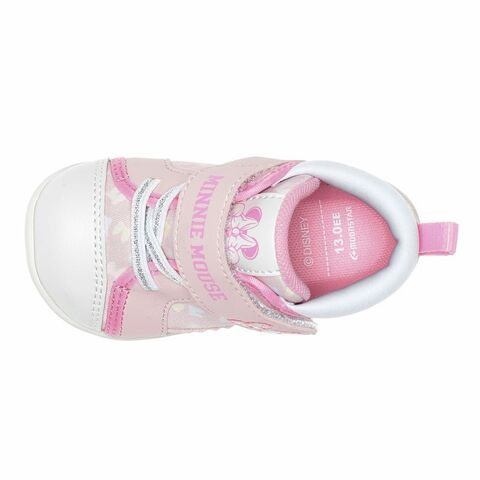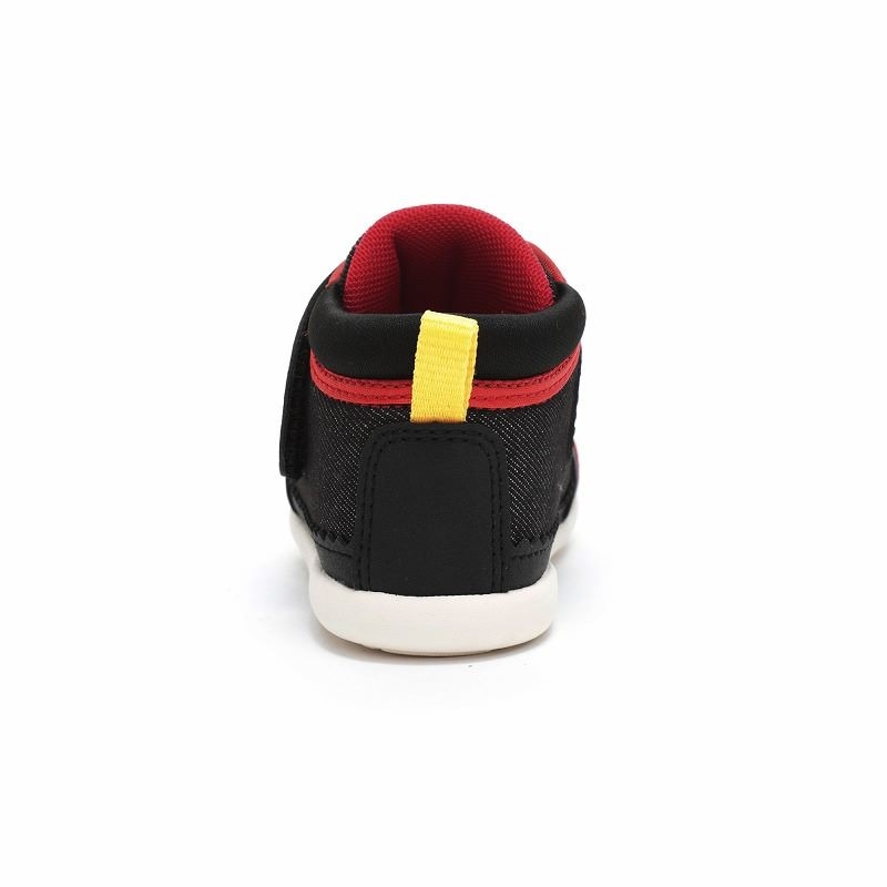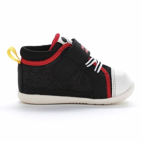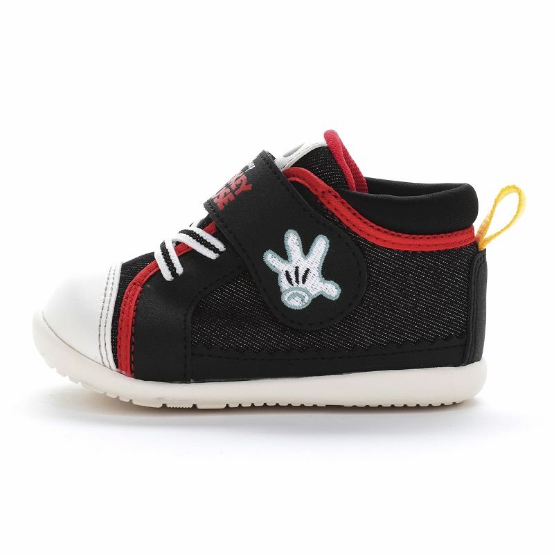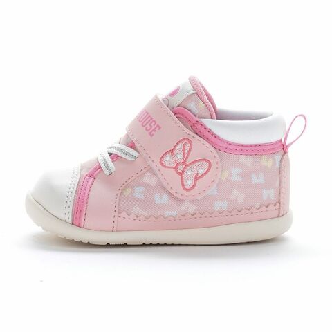 大人気ディズニーのベビーシューズです。よちよち歩きやつかまり立ちのお子様に履いていただけるミドルカットのベビーシューズです。ソフトな履き心地と履かせやすい甲バンド仕様で赤ちゃんやママ・パパに優しい作りになっています。コーディネートしやすいシンプルなカジュアルデザインなのでさまざまなお出かけにおすすめです。ポップなアートとシンプルなカラーリングが大人に好まれるデザイン、プレゼントにもおすすめな商品です。ブラックは「ミッキーマウス」、ピンクは「ミニーマウス」デザインです。【洗えるインソール】足裏になじみ、取り出して洗濯ができるので靴内を清潔に保てる中敷きです。