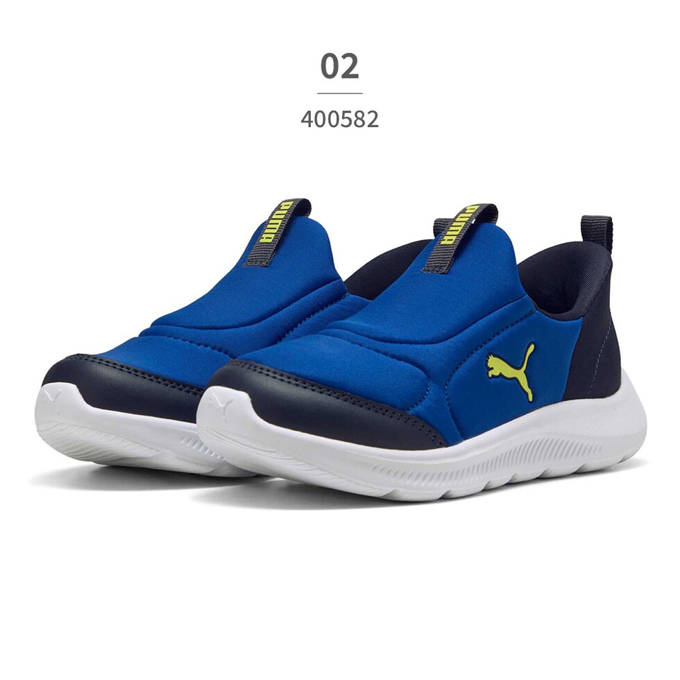 立ったまま、スッと履ける。伸び縮みする快適なアッパー、お子様に便利なスリッポン構造、大きなプーマキャットが目を引くプーマ ファン レーサー 2。クッション性が高く軽量なEVAインソールを採用しています。快適な履き心地でお子様のアクティブな毎日を足元から支えます。4歳から8歳のお子様におすすめのサイズ。
