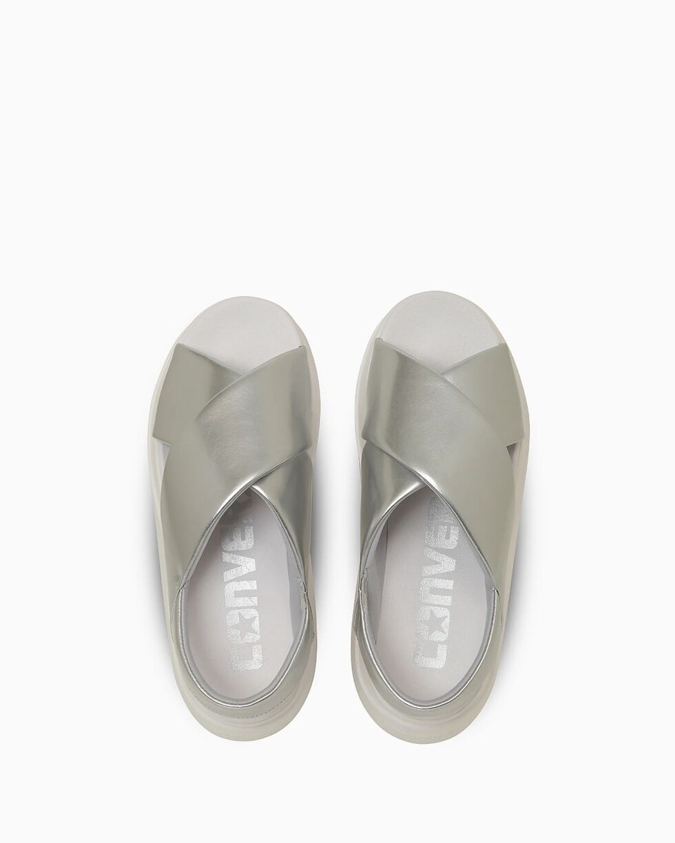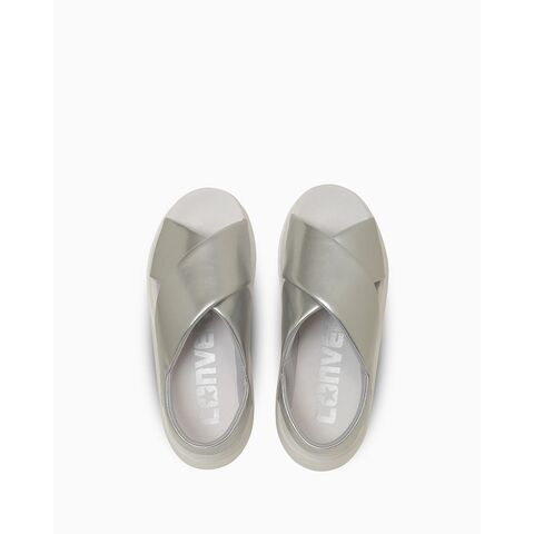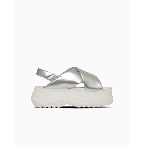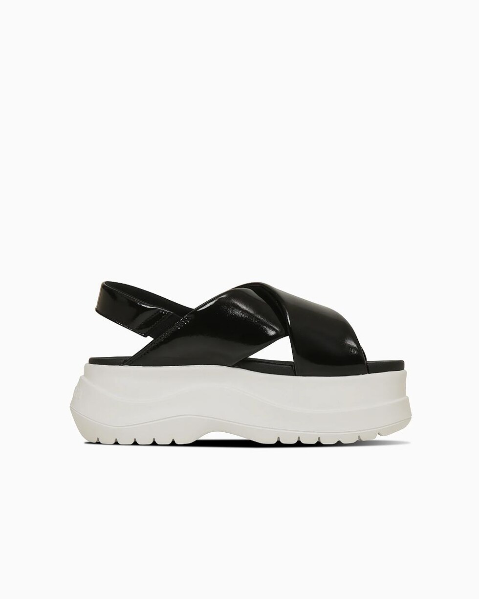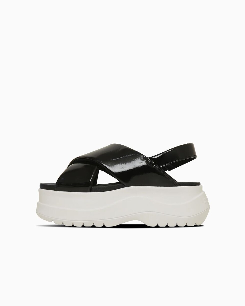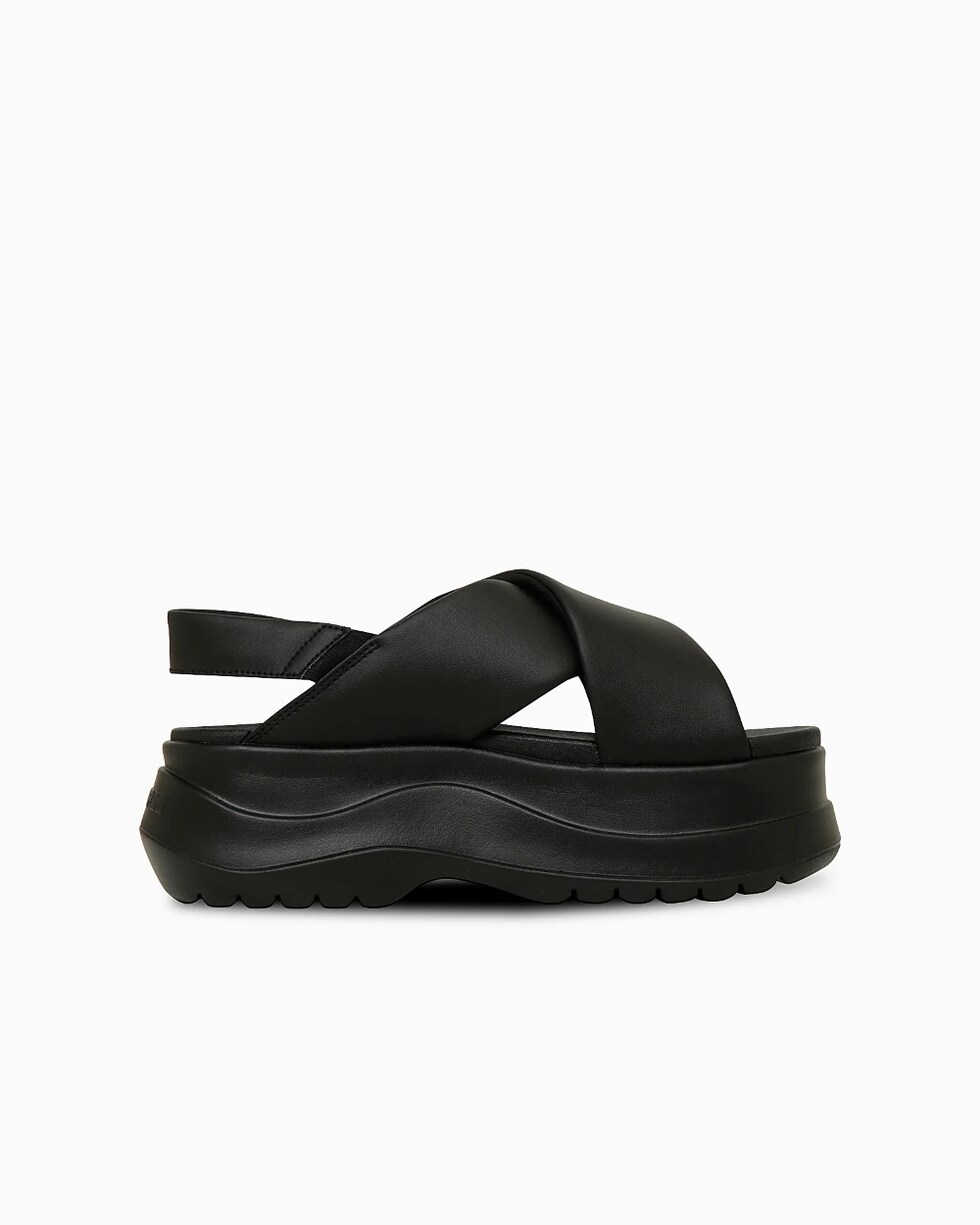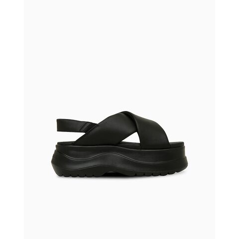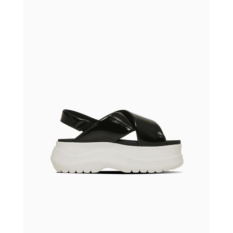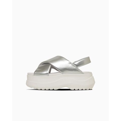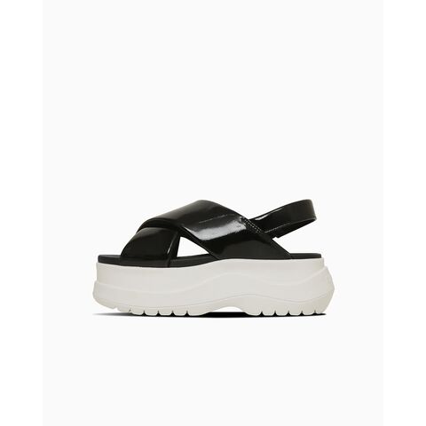 ボリュームのある厚底ソールとクロスベルトがエレガントなデザインで、幅広いコーディネートに取り入れられる一足。